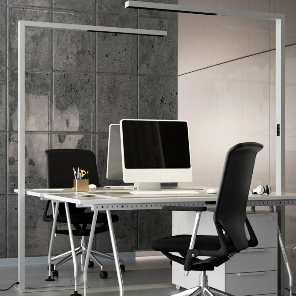 Functionele LED kantoor vloerlamp Jolinda met daglichtsensor, bewegingsmelder, dimmer en directe/indirecte verlichting Jolinda heeft een minimalistische, zeer moderne uitstraling, omdat de vloerlamp in principe slechts uit twee smalle stralen bestaat die in een rechte hoek ten opzichte van elkaar zijn geplaatst. Het licht schijnt naar boven en naar beneden, met vrijwel geen verblinding naar beneden, wat zorgt voor een zeer aangename lichtervaring die perfect is voor lange periodes van geconcentreerd werken aan het bureau. De LED vloerlamp is geschikt voor het verlichten van een bureau, dat dan wordt voorzien van helder licht. Het hoge niveau van functionaliteit moet ook worden vermeld, want Jolinda heeft niet alleen een dimfunctie, maar wordt ook geregeld via een daglichtsensor en een bewegingsmelder. Na dertig minuten afwezigheid schakelt het armatuur zichzelf uit en de daglichtsensor zorgt voor een relatief constante helderheid in de kamer, omdat het licht van de LED vloerlamp lichter of donkerder wordt afhankelijk van de helderheid buiten – met een U-vormige voet – UGR < 6 De armaturen zijn geoptimaliseerd voor een ideale, niet-verblindende en gelijkmatige verlichting van een standaard bureau van 160 cm x 80 cm. Het is daarom raadzaam om één lamp per bureau te gebruiken.