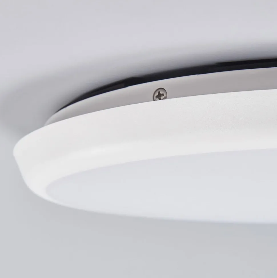 Ronde LED plafondlamp Augustin met hoge helderheid en beschermingsgraad IP54, selecteerbare lichtkleur Het ronde frame van Augustin is wit gelakt, terwijl de polycarbonaat kap met zijn witte oppervlak voor een goede, gelijkmatige lichtverspreiding zorgt. Alles bij elkaar is het uiterlijk aangenaam eenvoudig en tijdloos, waardoor de vochtbestendige LED plafondlamp ook kan worden gebruikt in een eersteklas technische omgeving. De LED’s creëren een energiezuinig licht dat zowel een heldere helderheid als een laag energieverbruik biedt. De lichtkleur is variabel en je kunt kiezen uit drie lichttemperaturen. Hiervoor wordt een schakelaar aan de achterkant van het armatuur bediend voordat de LED plafondlamp wordt geïnstalleerd, die in drie fasen kan worden geschakeld.