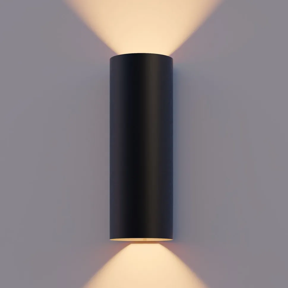 Cilindrische LED buitenwandlamp Round met glazen afdekkingen, spot boven en onder De buitenwandlamp Round wordt gebruikt voor moderne accent- en oriëntatieverlichting op gevels en entrees. De aluminium behuizing is ontworpen in een eenvoudige, hoge cilindrische vorm met een zwarte afwerking. Beschermd achter glazen afdekkingen zijn twee warmwitte LED lichtbronnen geïntegreerd; hun licht wordt naar boven en beneden uitgestraald – Beschermingsgraad: IP54 – Inclusief LED driver met constante stroom (aan/uit)