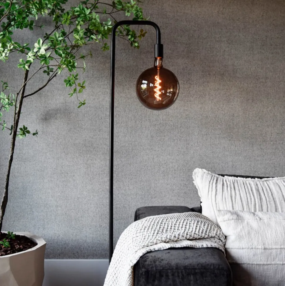 U-Line vloerlamp met voetschakelaar en open fittingDe U-Line vloerlamp is gemaakt van metaal en is gelakt in één kleur. Ze is uitgerust met een voetschakelaar voor het gemakkelijk in- en uitschakelen. Het bovenste uiteinde van het frame is meerdere malen gebogen zodat de open fitting naar beneden wijst. Het is daarom bijzonder geschikt voor grote en opvallende lichtbronnen waarvan de gloeidraden zichtbaar zijn. Bijpassende E27 lampen zijn apart verkrijgbaar via de accessoires.De afgebeelde lichtbronnen maken geen deel uit van de levering en dienen slechts als voorbeeld.