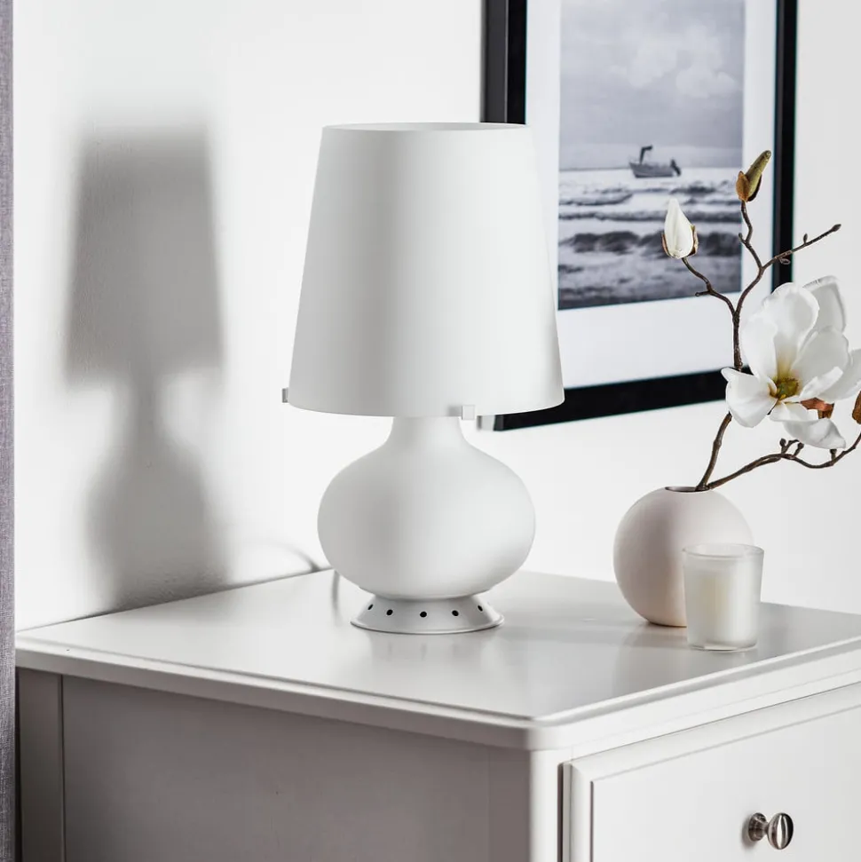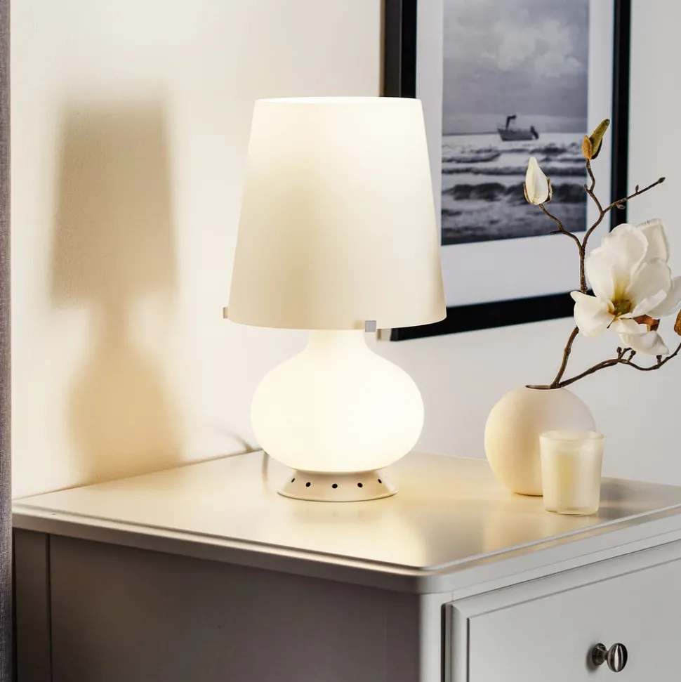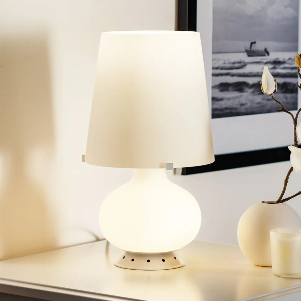 Witte tafellamp FONTANA – een klassieker van Fontana ArteFONTANA is een ideale tafellamp als je op zoek bent naar gezellige kamerverlichting. De lamp, die bijna volledig uit wit gesatineerd glas bestaat, is een aantrekkelijk verlichtingsobject dat toch niet opdringerig lijkt, maar perfect in de ruimte past en prachtig gecombineerd kan worden met krachtige kleuren. Het ongebruikelijke bolvormige onderste gedeelte is bijzonder mooi om te zien en kan net als de lampenkap worden verlicht, en de dubbele schakelaar maakt variabele instellingen mogelijk. Het netsnoer en de schakelaar zijn zwart.Fontana Arte is een lampenfabrikant die al bestaat sinds 1932 en al jaren internationale populariteit geniet met zijn originele collecties. De zeer nauwe en vruchtbare relatie tussen het bedrijf, architecten en ontwerpers vormt de basis voor de creativiteit en de bijzondere, innovatieve productiekracht van het bedrijf. Het doel van Fontana Artes is om een evenwicht te creëren tussen het functionele doel van een armatuur en het creëren van een visuele verrijking voor elke ruimte. Het recept voor succes is de symbiose van klassieke designidealen en moderne designelementen, die een openheid voor innovatieve ideeën weerspiegelt en het bedrijf zo in staat stelt om verder te gaan dan commerciële behoeften. Talrijke onderscheidingen bevestigen de individualiteit van Fontana Artes producten.