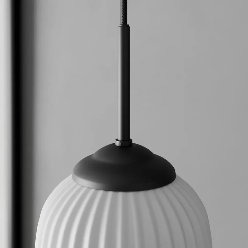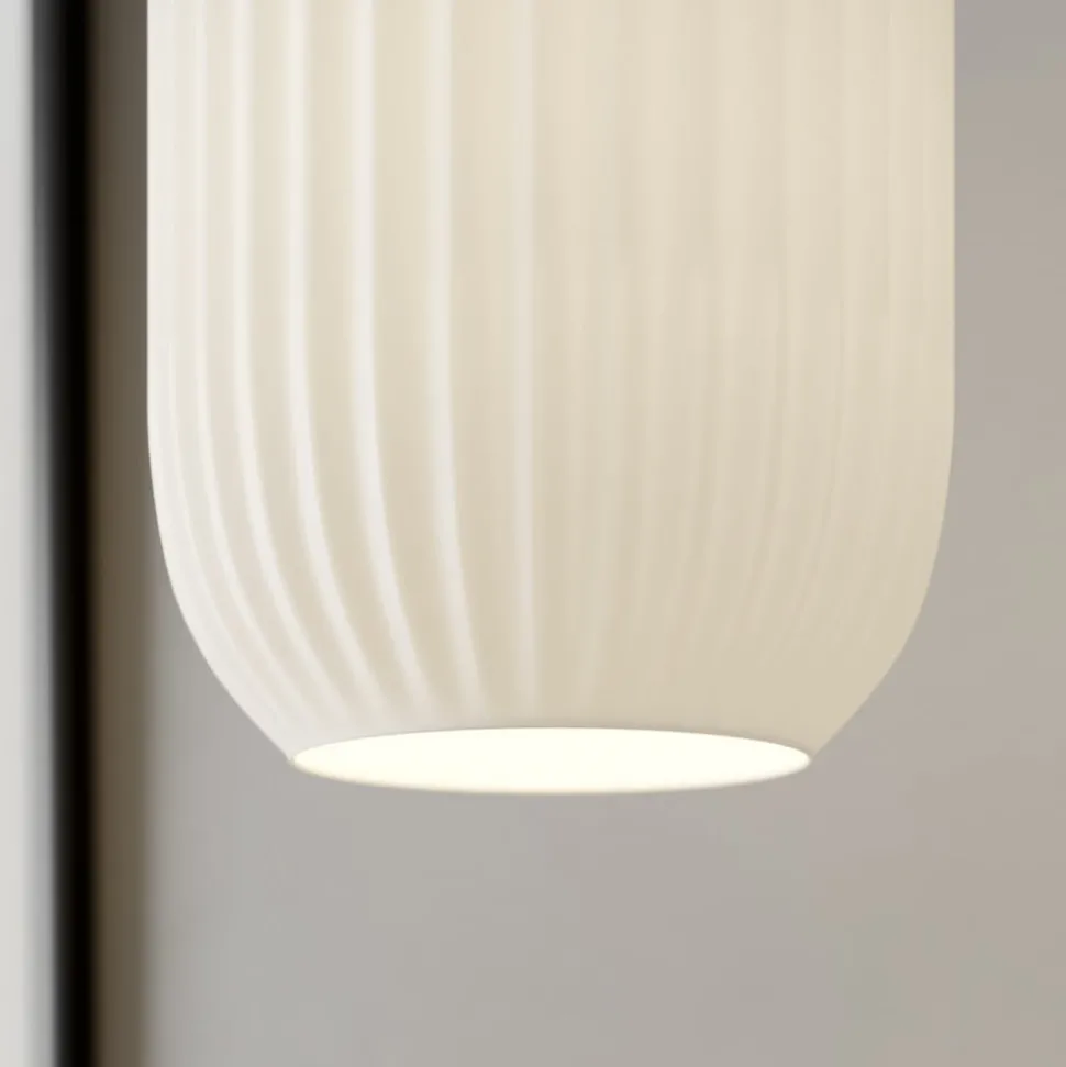 Riflet hanglamp met witte glazen kap met gegroefd patroon De Riflet hanglamp met zijn smalle, bijna ovaalvormige kap van opaalwit glas met een mooi gegroefd patroon rondom creëert een zeer aangenaam en niet-verblindend licht en verlicht de omgeving zacht en gelijkmatig. Ze kunnen afzonderlijk worden gebruikt om kleinere tafels of ruimtes te verlichten, of in rijen of clusters van dezelfde of verschillende afmetingen worden opgehangen om grote tafels of toonbanken te verlichten. Riflet is een serie armaturen van het Deense label Dyberg Larsen, een bedrijf dat zich richt op het ontwikkelen van betaalbare armaturen met een mooi design en goede kwaliteit.