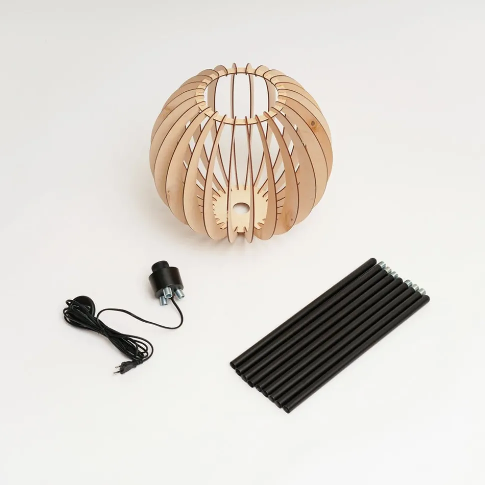 Clay vloerlamp met zwart metalen frame en berkenmultiplex kap De Clay vloerlamp bestaat uit een metalen frame met drie poten en een bolvormige kap van licht berkenmultiplex. De combinatie van kleuren en materialen oogt modern en natuurlijk tegelijk en contrasteert aantrekkelijk, waardoor de vloerlamp een prachtige blikvanger is. De lampenkap bestaat uit losse houten elementen die uit elkaar staan. De lichtbron is niet inbegrepen en kan dus vrij worden gekozen. Het open ontwerp van de lampenkap biedt een decoratieve lichtbron voor gebruik. Het licht wordt naar het plafond en naar de zijkanten uitgestraald en geeft speciale licht- en schaduweffecten door het patroon van de lampenkap. De vloerlamp is geschikt voor gebruik in bijvoorbeeld de hal, in de slaapkamer en in de woonkamer. De Clay lamp is een product van het merk Envostar en bestaat uit FSC-gecertificeerd berken multiplex dat afkomstig is uit duurzaam beheerde gebieden. Envostar laat zijn producten in Europa maken, waardoor de transportroutes kort zijn en de CO2-uitstoot laag. Voor de verpakking zijn recyclebare materialen gebruikt.