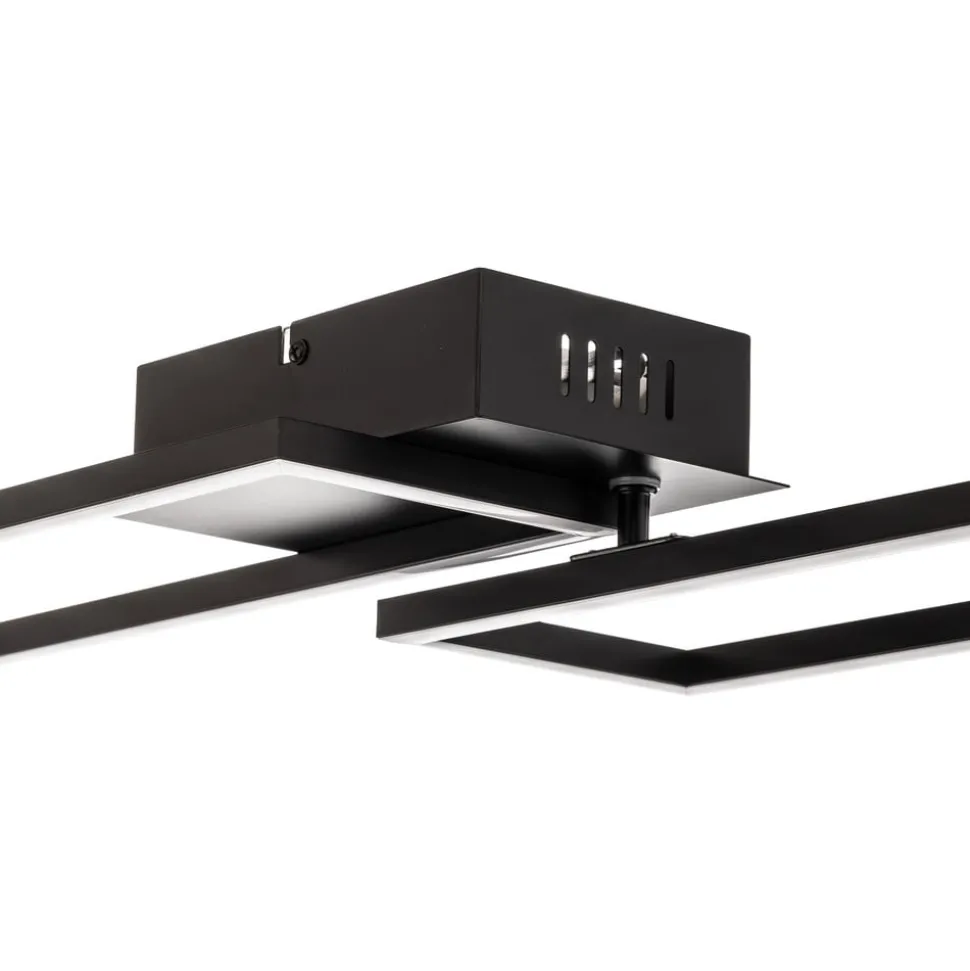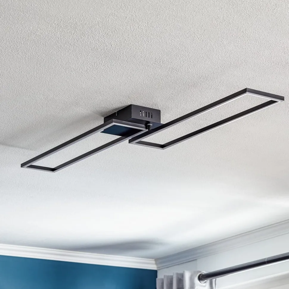 Frame LED plafondlamp van metaal met veranderbare lichtkleur en afstandsbediening Twee smalle, rechthoekige frames van zwart metaal vormen de kap van deze LED plafondlamp. Achter gesatineerde kunststof afdekkingen zitten de LED’s, die met de meegeleverde afstandsbediening op elk moment in lichtkleur kunnen worden aangepast van warmwit licht tot universeel wit licht en ook in helderheid kunnen worden aangepast om de verlichting op elk moment aan de eisen aan te passen. Deze flexibiliteit maakt een veelzijdig gebruik van de moderne plafondlamp mogelijk, of het nu voor verlichting van de woonkamer, keuken of het thuiskantoor is. Naast het flexibel instelbare verlichtingsontwerp biedt de LED plafondlamp ook een nachtlichtfunctie en een Tim.