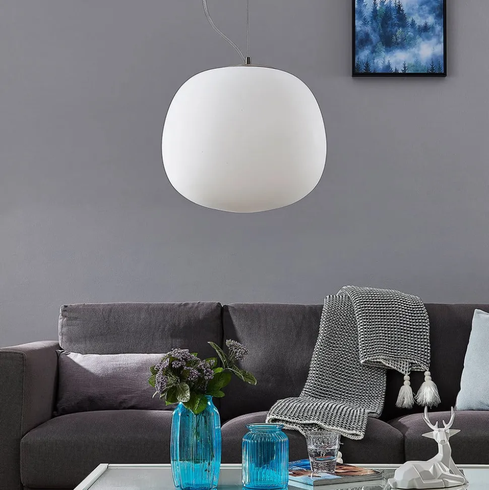 Ronde hanglamp Ginevra van wit opaalglas – ideaal voor de hele woonkamer Ginevra ziet er buitengewoon stijlvol uit en belichaamt met haar ronde, bijna organische kapvorm iets absoluut harmonieus en aantrekkelijks over de hele linie. Het witte glas van de kap laat het licht warm en gelijkmatig in de omgeving schijnen, waardoor een hanglamp met een heel gezellig effect ontstaat die prachtig in de woonkamer past.