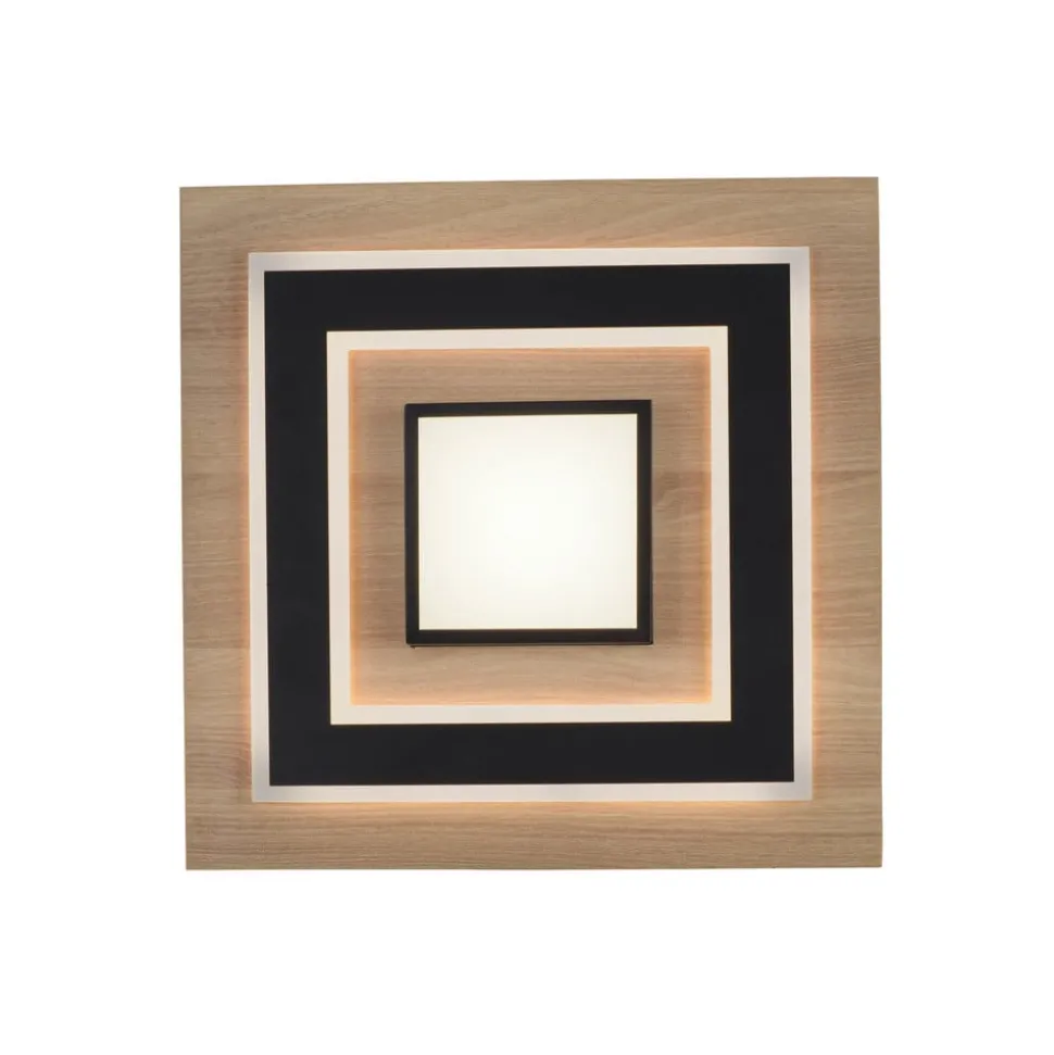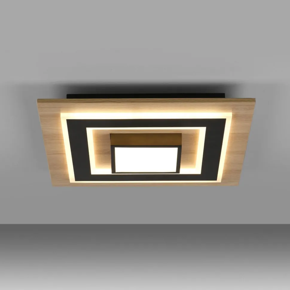 Vierkante LED plafondlamp Tola met twee lichtelementen Tola is een plafondlamp in een mooie combinatie van hout en zwart metaal die warmwit licht uitstraalt en flexibele verlichting biedt. Met de lichtschakelaar kunnen het lichtelement in het midden en de LED’s aan de randen van het zwarte frame achter satijnen diffusors afzonderlijk of samen worden ingeschakeld, zodat de helderheid van de warmwitte LED’s naar wens kan worden aangepast.