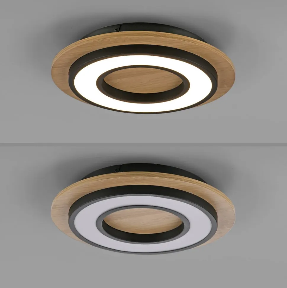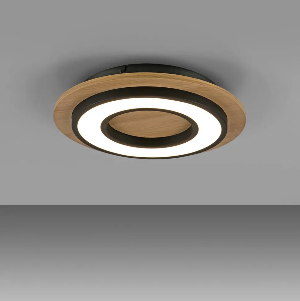 Ronde LED plafondlamp Tola met houten plaat en metalen ring Een ronde houten plaat en een zwarte metalen ring met een gesatineerde afdekking aan de bovenkant – dat is de LED plafondlamp Tola. Deze ring bevat warmwitte LED’s waarvan het licht homogeen naar beneden wordt uitgestraald. Tola is een plafondlamp die in veel ruimtes in huis kan worden geïntegreerd en energiezuinige verlichting uitstraalt.