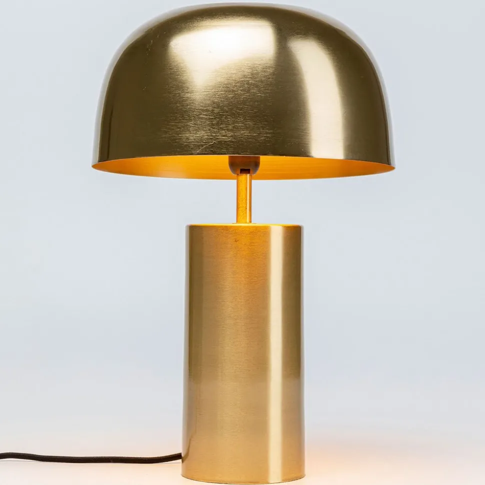 Tafellamp Loungy Gold met een elegante, opvallende gouden kap De tafellamp Loungy Gold is volledig gemaakt van met messing bekleed staal en heeft een fascinerende, glanzende gouden kleur. Het is een echte blikvanger en kan gemakkelijk worden geïntegreerd in moderne inrichtingsstijlen. De stabiele, cilindervormige voet is door een fijne verbindingsstang iets verschoven ten opzichte van de kap, die de vorm heeft van een halve bol. De kap is open aan de onderkant, waardoor het licht alleen naar beneden kan ontsnappen. De lichtgekleurde binnenkant van de kap reflecteert het licht in warme tinten naar buiten. Aan het bovenste uiteinde van de verbindingsstang is een E14 lampvoet bevestigd, waarin elke E14 lamp kan worden gestoken. Suggesties zijn verkrijgbaar via de accessoires. De tafellamp kan gemakkelijk worden bediend en onafhankelijk worden in- en uitgeschakeld met de praktische tuimelschakelaar op het snoer. De ondoorzichtige kap maakt de lamp bijzonder geschikt voor discrete sfeerverlichting en voor het creëren van een gezellige sfeer.