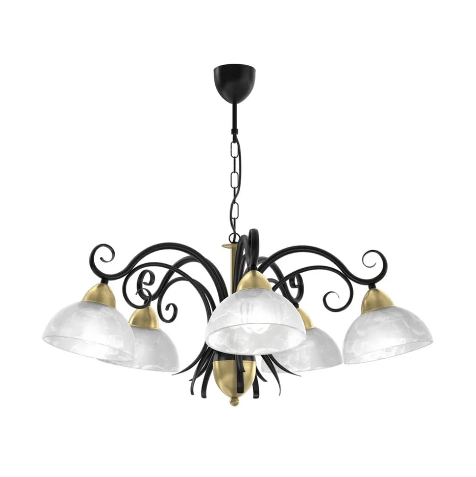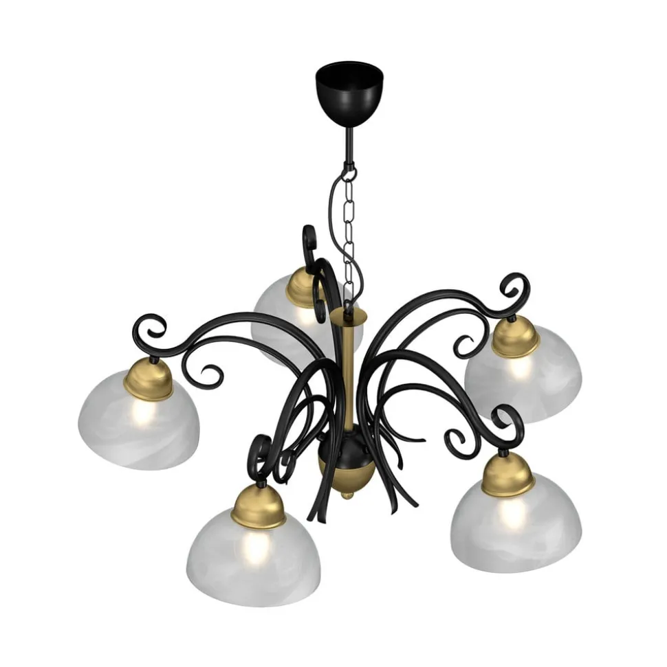 De kroonluchter Flora combineert rustieke charme met moderne elegantie en is daarmee een blikvanger in elke woon- of eetkamer. Hij is gemaakt van hoogwaardig staal en glas en straalt een tijdloze esthetiek uit die harmonieus past in verschillende interieurstijlen. De combinatie van gesatineerd zwart en messing geeft de kroonluchter een elegante uitstraling, terwijl de vijf glazen kappen zorgen voor een gelijkmatige en aangename lichtverspreiding.