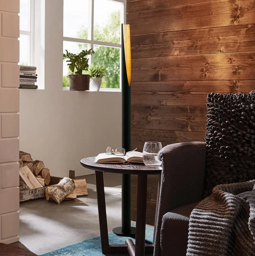 De LED-lamp bevindt zich in het langwerpige lichaam van de vloerlamp en straalt door een sterk toelopende opening naar het plafond. Van buiten is het stalen lichaam van de lamp zwart gelakt, zodat met het gouden accent in het bovenste gedeelte een aantrekkelijk kleurcontrast ontstaat. Met zijn eenvoudige maar nobele uiterlijk kan de lamp worden geïntegreerd in verschillende woonconcepten.
