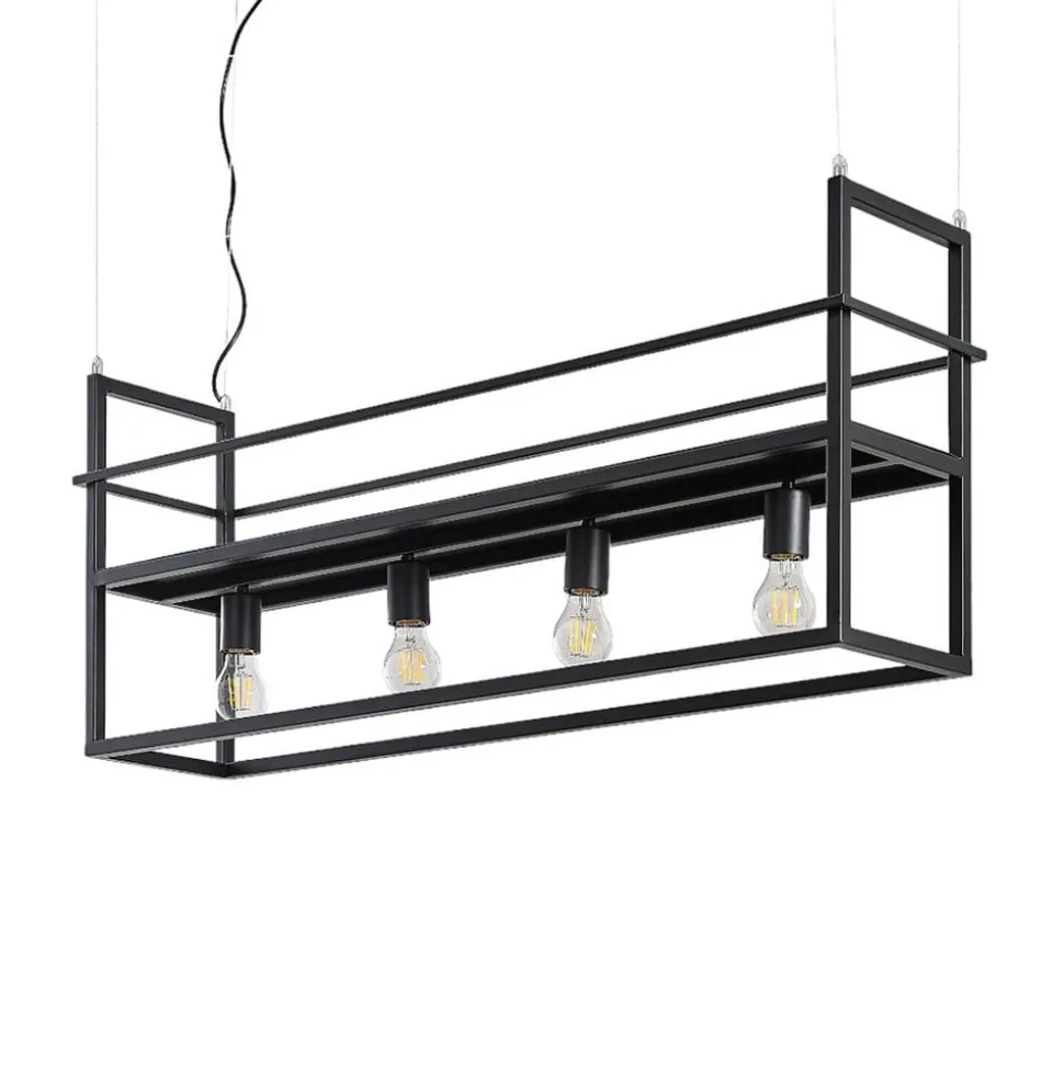 Metalen hanglamp Grisela in zwart met prachtige ophanging De 4-lamps hanglamp Grisela is niet alleen een lichtbron, maar ook een hangplank waarop kleinere decoratieve voorwerpen kunnen worden uitgestald. Ze past zowel in een moderne eetkamer als in de keuken boven een kookeiland of aanrecht en kan bijvoorbeeld worden voorzien van kleine kruidenpotjes of kruidenpotjes. Het frame van de lamp is gemaakt van mat zwart gelakt staal, wat in combinatie met het lineaire ontwerp zorgt voor een moderne uitstraling. De ophanging aan vier stalen kabels versterkt de moderne touch. De hanglamp Grisela wordt geleverd met twee ophangsets – één in zwart en één in transparant. De lamp is voorzien van vier naar beneden gerichte E27 fittingen, waarin de lampen vrij zichtbaar zijn. Er ontstaat een zeer aantrekkelijke look als er decoratieve lampen worden gekozen – bijvoorbeeld energiezuinige en duurzame LED lampen met helder of licht getint glas en een gloeidraadlook.