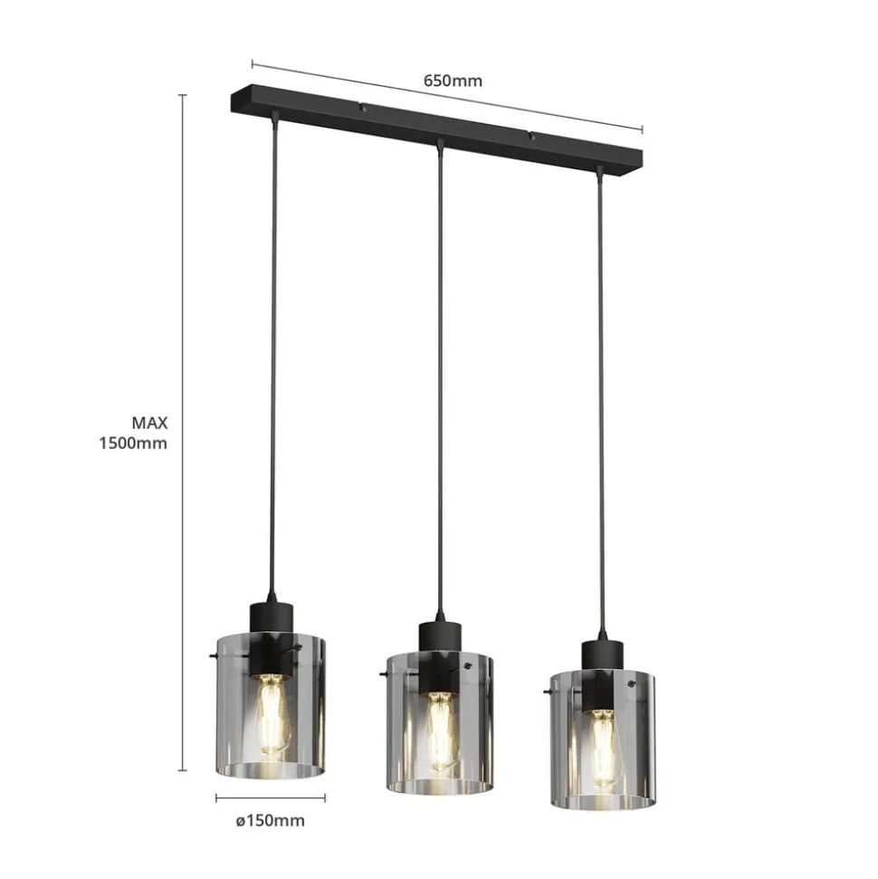 3-lamps hanglamp Kourtney maakt indruk met haar prachtige rookgrijze glas De hanglamp Kourtney maakt indruk met haar drie kappen in een trendy rookglaslook. Rookgrijs beschrijft de aantrekkelijke kleur van het glas. De look dankt zijn naam aan het feit dat het glas lijkt te zijn verkleurd door de rokerige vlam van een kaars. Het donkergekleurde glas zorgt ervoor dat het licht zachtjes doorschijnt. Hierdoor schijnt het licht niet zo fel en verblindt het niet. Daarom is Kourtney zeer geschikt als hanglamp voor kamers die gezelligheid vereisen. De lamp slaat een bijzonder goed figuur in een woonkamer of eetkamer, vooral omdat ze door haar langwerpige vorm boven een tafel kan worden gemonteerd.