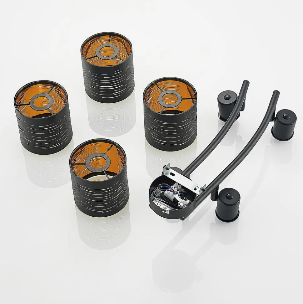 4-lamps Iolyn plafondspot met zwarte en gouden kappen Modern in zijn ontwerp biedt de Iolyn plafondspot uitstekende sfeerverlichting. Of het nu in de woonkamer, een hal of andere woonruimtes is, de spot met 4-lamps biedt voldoende licht en een moderne look. Hij bestaat uit vier in verschillende richtingen draaibare kappen met een zwart design aan de buitenkant en een gouden kleur aan de binnenkant. De kleine opengewerkte vlakken op de kap laten het goud naar buiten schijnen, waardoor er een speciale sfeer ontstaat, zelfs als het licht aan is.