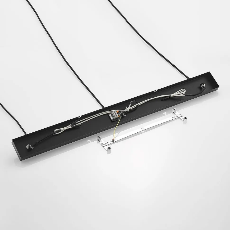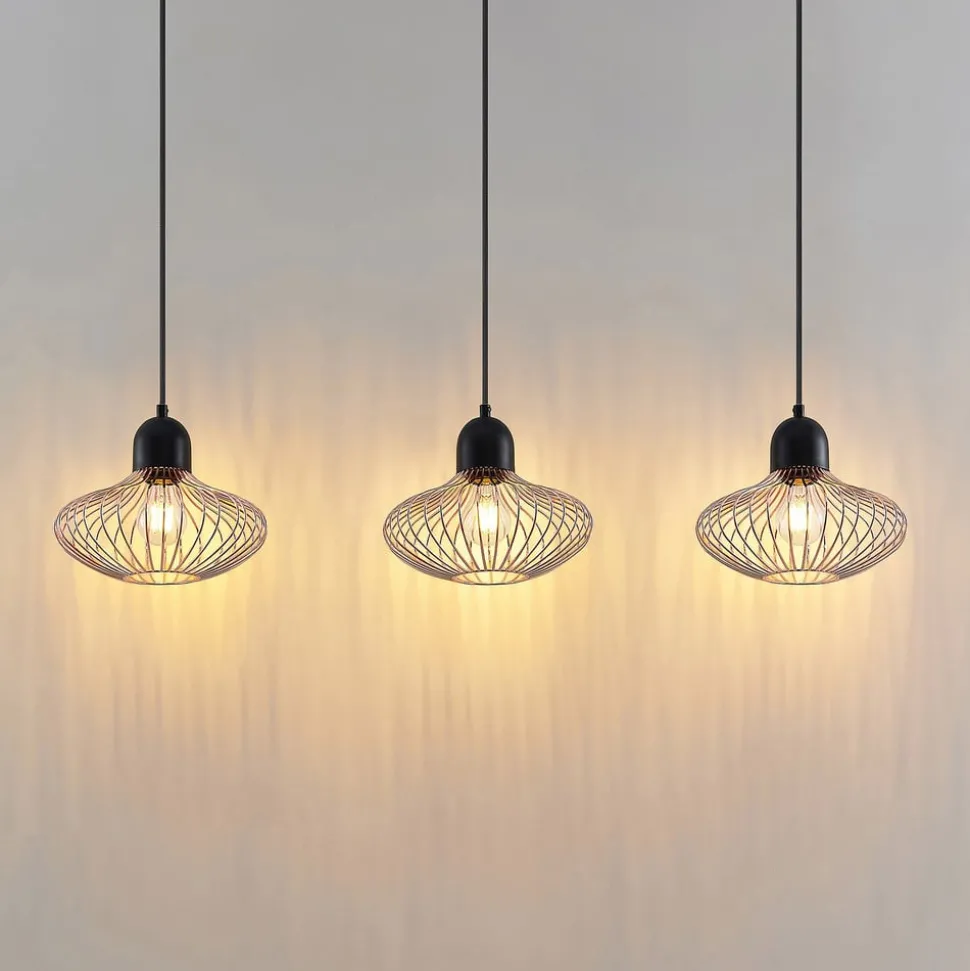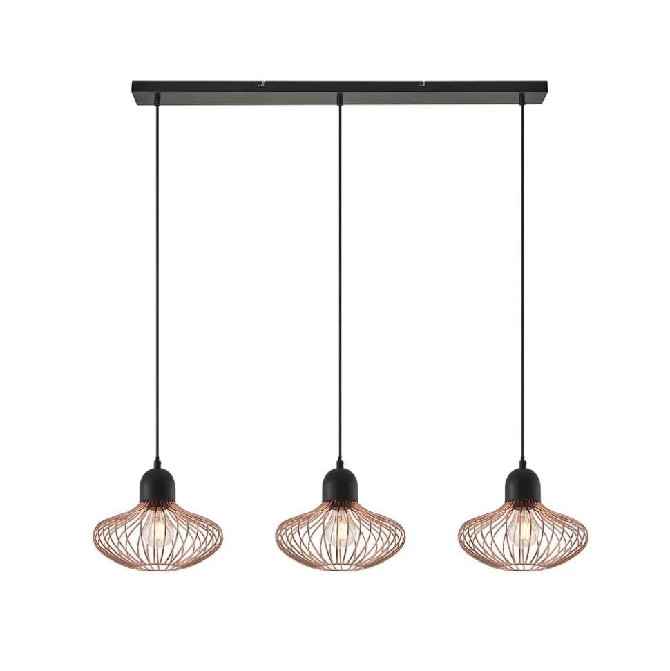 3-lamps Justinos hanglamp van ijzer met koperkleurige kappen De Justinos hanglamp maakt indruk met zijn moderne ontwerp en contrasterende kleurstelling. Ze is gemaakt van ijzer en bestaat uit een langwerpige plafondhouder in zwart en drie kappen in een aantrekkelijke koperkleur. Het uiterlijk van de kappen doet denken aan kooien en hun slanke stutten omringen een fitting die kan worden voorzien van passende lampen. De Justinos hanglamp biedt niet alleen betrouwbare verlichting, maar past met zijn eigentijdse look ook gemakkelijk in verschillende inrichtingsstijlen en plaatst harmonieuze accenten binnen de inrichting.