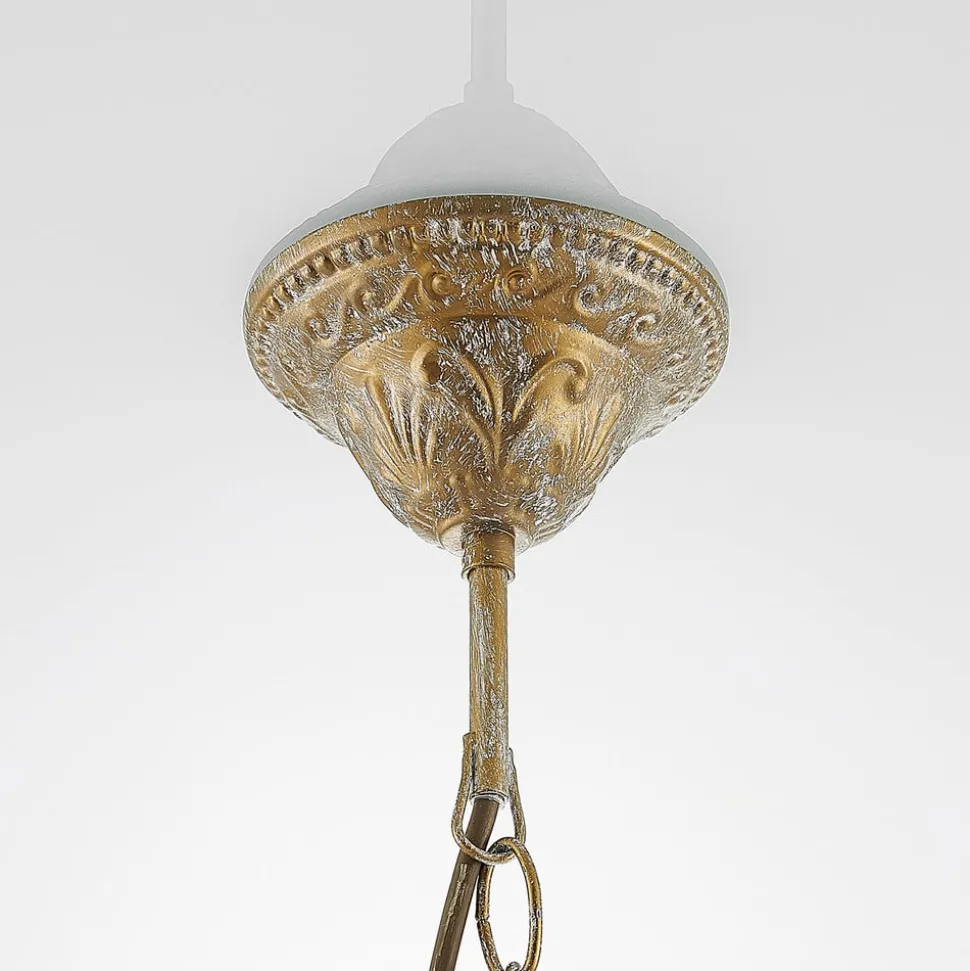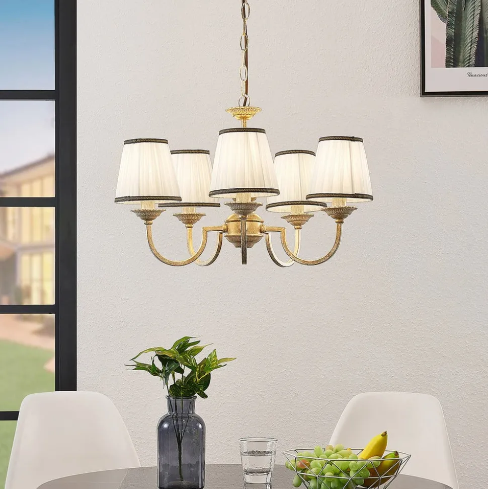 5-lamps kroonluchter Lumiel in landhuisstijl De kroonluchter Lumiel slaat een bijzonder goed figuur in rustieke interieurs in landhuisstijl. De vijf crèmekleurige kappen zijn gemaakt van stof en versierd met donkere biezen aan de boven- en onderkant. Het antieke messing frame met zijn gebogen vormen versterkt het antieke karakter van de kroonluchter en geeft Lumiel een zekere gratie. De kroonluchter is bijzonder geschikt voor het verlichten van een eettafel, waarboven hij ook een elegante sfeer creëert.