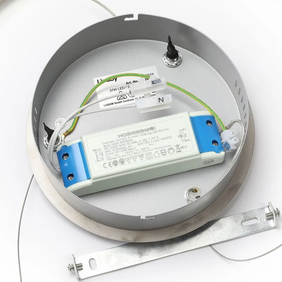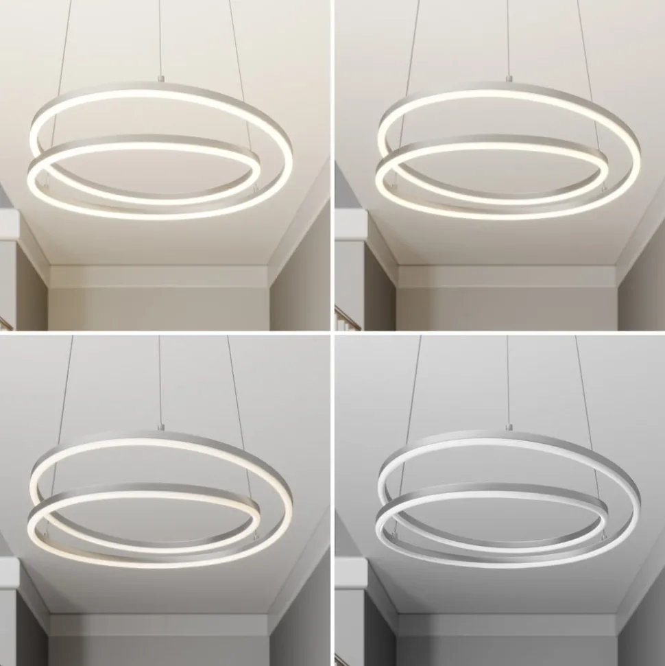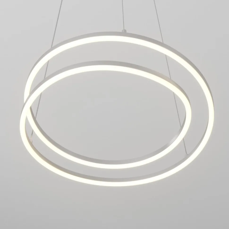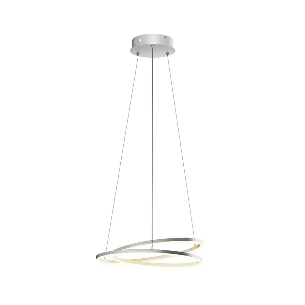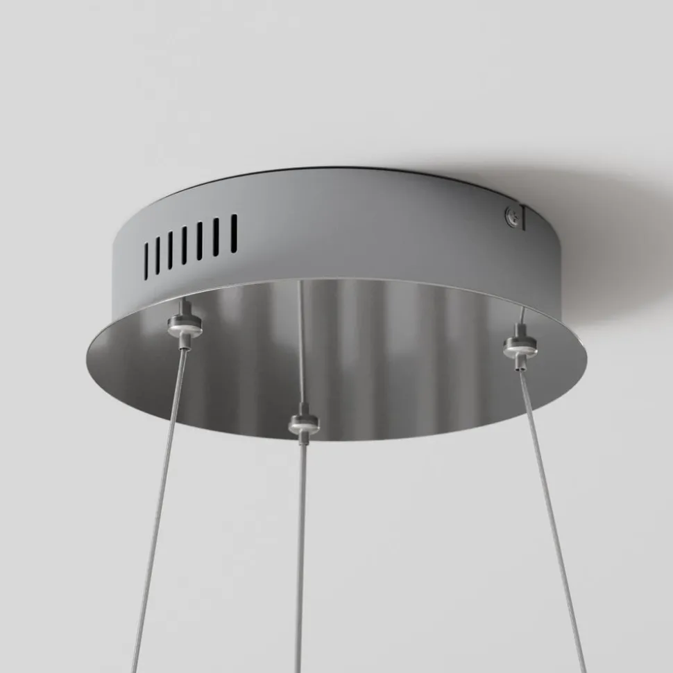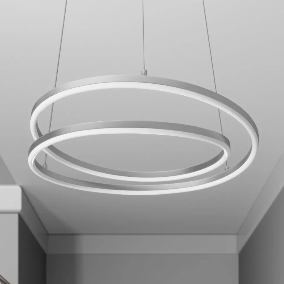 Davian dimbare LED hanglamp met satijnnikkel afwerking en filigraan verlichte ringen Davian is ideaal voor eettafelverlichting in moderne kamers, omdat de hanglamp een bijna puristische uitstraling heeft. Ze wordt visueel gedomineerd door de constructie van twee ringen of een spiraal van metaal, die delicaat bewerkt is en bedekt met een LED-stripverlichting. Dit creëert een mooi, helder licht dat wordt gekenmerkt door een goede energie-efficiëntie en dat indien gewenst ook dimbaar is. Er zijn geen aparte accessoires nodig om de helderheid te regelen; de lichtschakelaar aan de muur volstaat om de helderheid in drie stappen aan te passen. Dit maakt Davian tot een echte HighLight met visuele en technische kwaliteiten.
