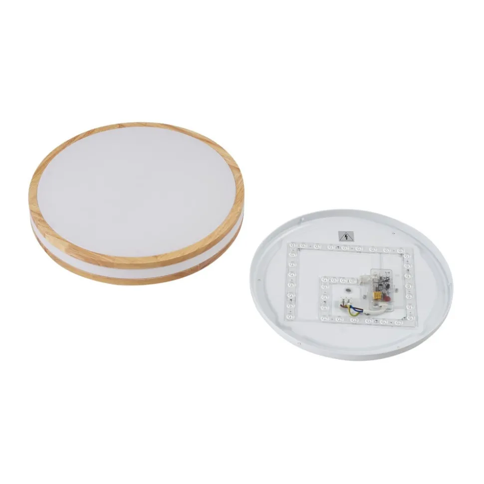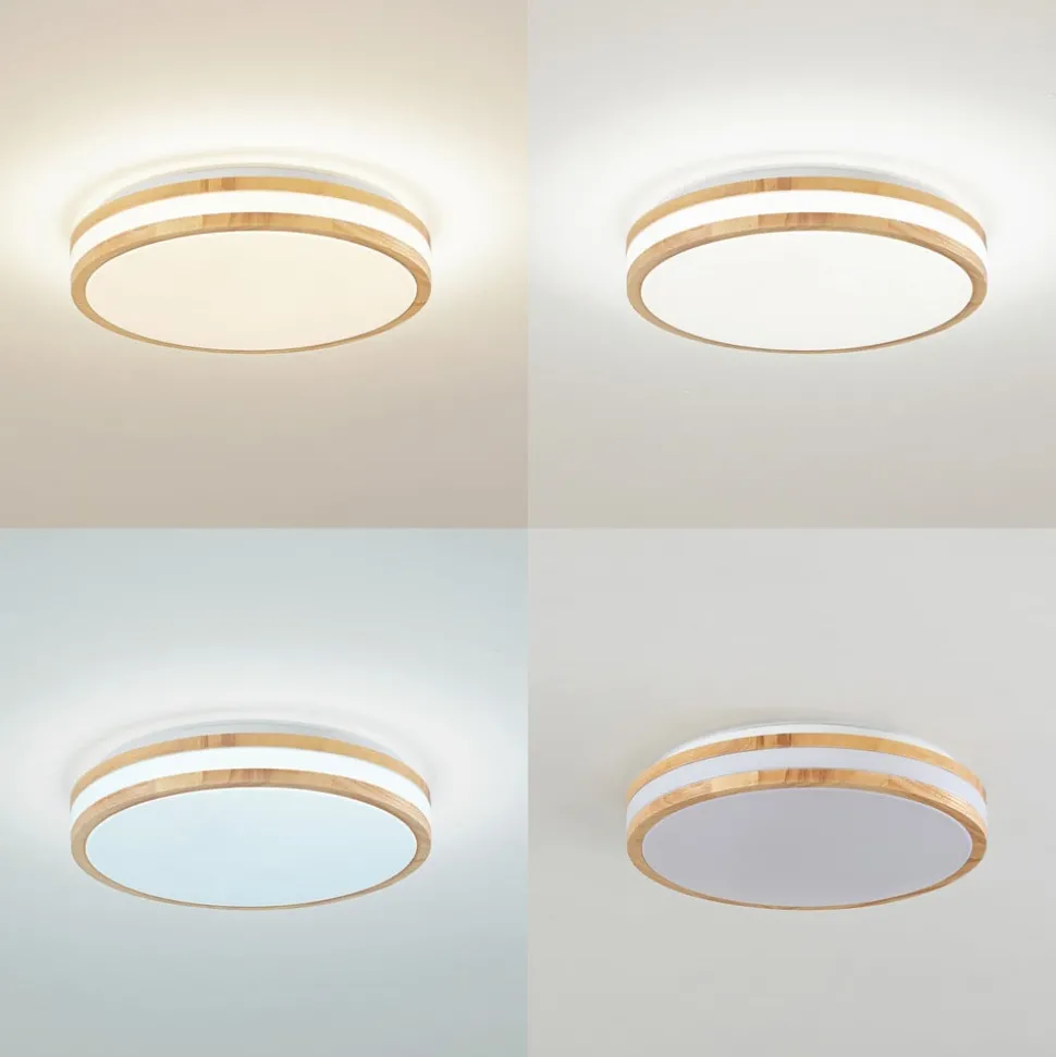 Ronde Emiva LED plafondlamp van hout met praktische CCT-functie De Emiva LED plafondlamp combineert modern design met de warmte van houten elementen en biedt een stijlvolle verlichtingsoplossing die naadloos past in moderne en Scandinavische interieurs. Met een diameter van 39,5 cm is deze plafondlamp een blikvanger die niet alleen indruk maakt met haar esthetische uiterlijk, maar ook met haar innovatieve regelbare lichtkleur. Dit maakt het mogelijk om de lichtkleur aan te passen aan de gewenste sfeer – van warme tinten voor een gezellige sfeer tot koelere nuances die de concentratie bevorderen. De CCT-functie wordt geregeld door herhaaldelijk op een alledaagse wandschakelaar te drukken.