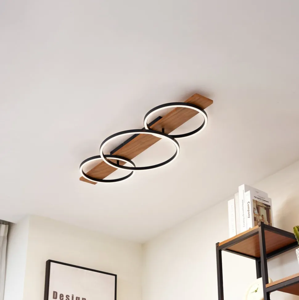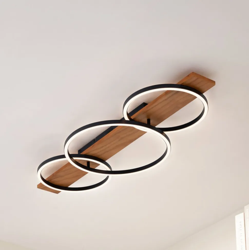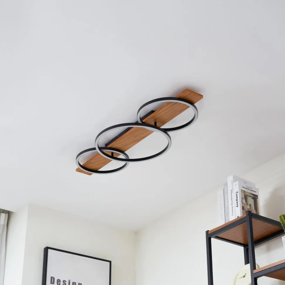 Galad LED plafondlamp met drie lichtkringen en praktische dimfunctie Ervaar hoe de Galad LED plafondlamp met haar stijlvolle design in wit en zwart en warme houtlook elke ruimte een speciaal tintje geeft. De 3-lamps armatuur is niet alleen een visuele HighLight, maar maakt ook indruk met zijn geïntegreerde LED lichtbron, die zorgt voor energiezuinige verlichting. De moderne stijl van plafondlamp Galad past naadloos in verschillende woonruimtes zoals de eetkamer, woonkamer, keuken of hal. De lamp kan zoals gebruikelijk met een wandschakelaar worden in- en uitgeschakeld. Dankzij de 3-staps dimtechnologie met geïntegreerde uit-functie kan de lamp ook tot drie verschillende helderheidsniveaus worden gedimd door meerdere keren op de schakelaar te drukken: 100%, 50% en 10%.