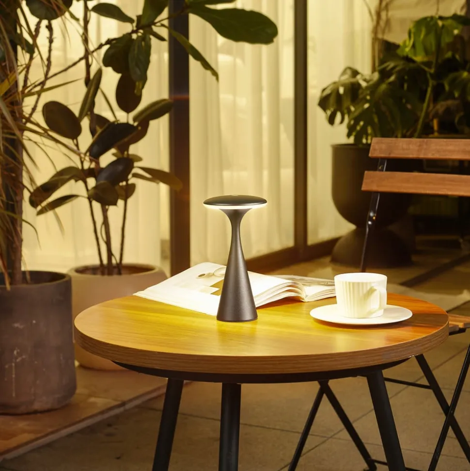 Praktische LED tafellamp Evelen voor gebruik in de tuin, op het terras of op het balkon De moderne, paddenstoelvormige LED tafellamp Evelen is een stijlvol verlichtingsobject voor gezellige decoratieve verlichting buitenshuis (beschermingsgraad IP54). De lamp wordt opgeladen via USB en kan traploos worden gedimd en de lichtkleur kan in drie stappen worden gewijzigd (2.200 K, 2.700 K, 3.000 K) – incl. USB-C-kabel