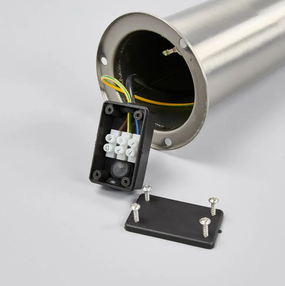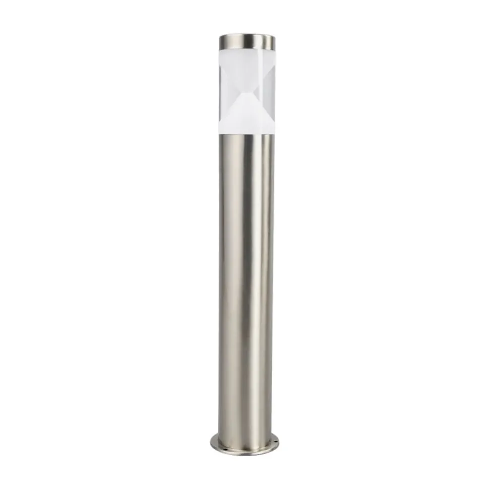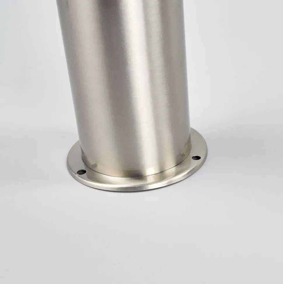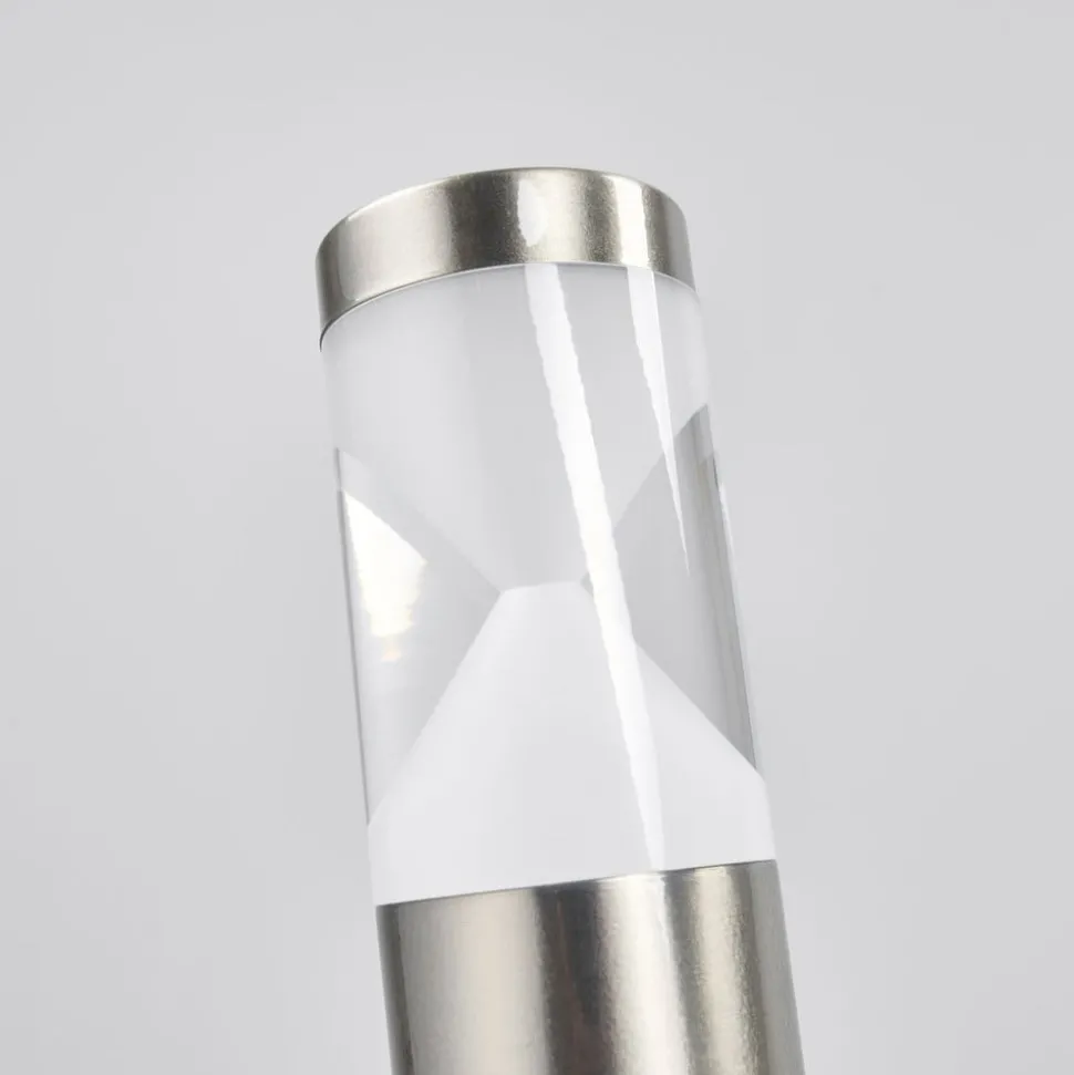 Mooie Fabrizio LED tuinpadverlichting met een moderne look en cilindrische roestvrijstalen behuizing Fabrizio komt bijzonder goed tot zijn recht in de omgeving van moderne architectuur. De LED tuinpadverlichting heeft een ronde basisvorm en het roestvrij staal wordt aangevuld door een kunststof kap die boven de LED lampen zit. Twee gesatineerde kegels zitten direct boven de lampen, die samen het beeld van een zandloper creëren, en de totale cilindrische vorm wordt verzekerd door een heldere acrylbuis die eromheen past.