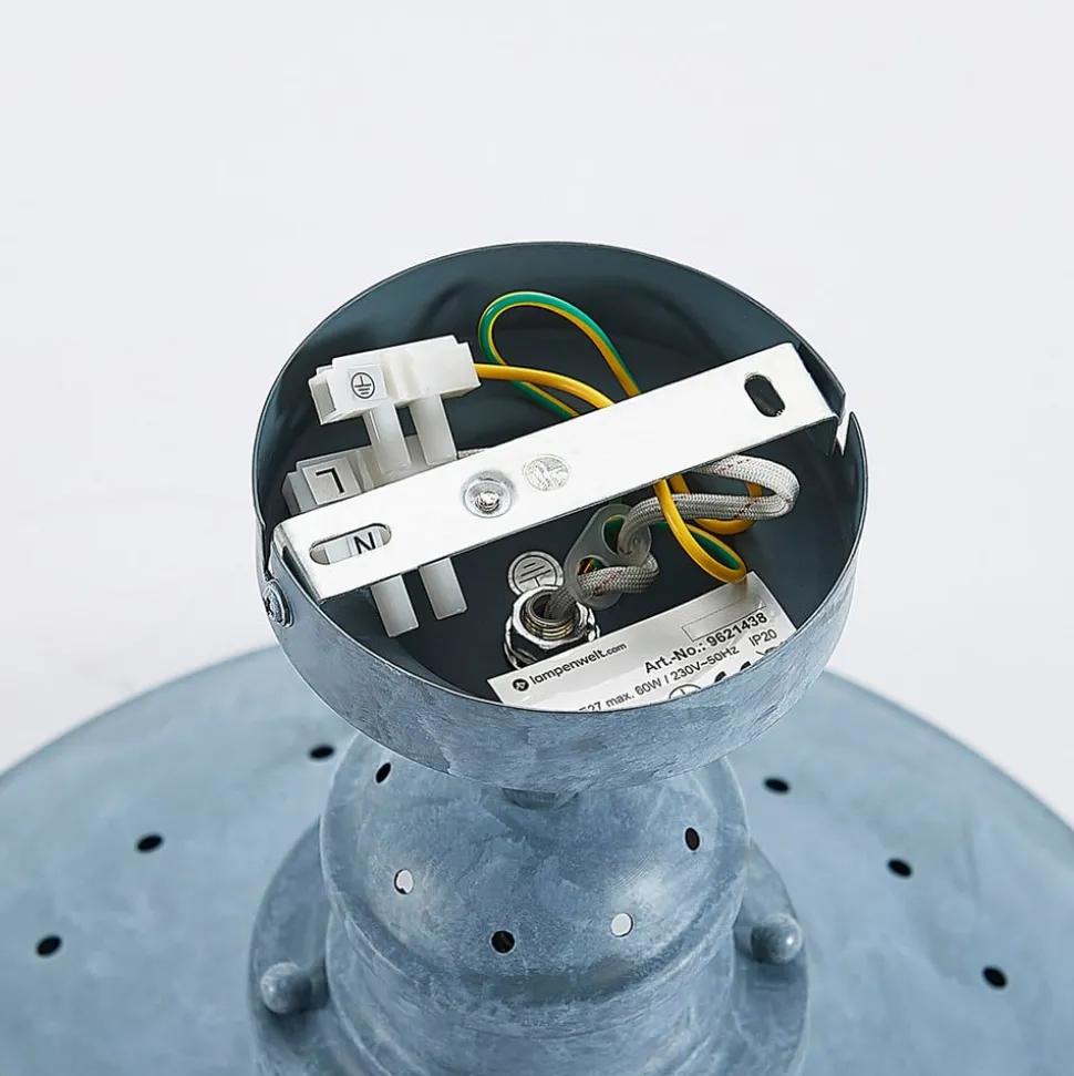 Industrieel ogende plafondlamp Louisanne van betongrijs metaal Louisanne ziet er inderdaad uit als een plafondlamp met een antiek karakter omdat er bekende vormen uit het verleden zijn gebruikt. Bovendien heeft het oppervlak van de metalen kap een betongrijze afwerking gekregen, die een industrieel karakter heeft. Louisanne is daarom een plafondlamp die zowel gecombineerd kan worden met industriële stijlen als met interieurs waarin antieke elementen zijn geïntegreerd. Afhankelijk van de lichtinval kan de grijze kleur van het armatuur variëren van groen tot blauwachtig.
