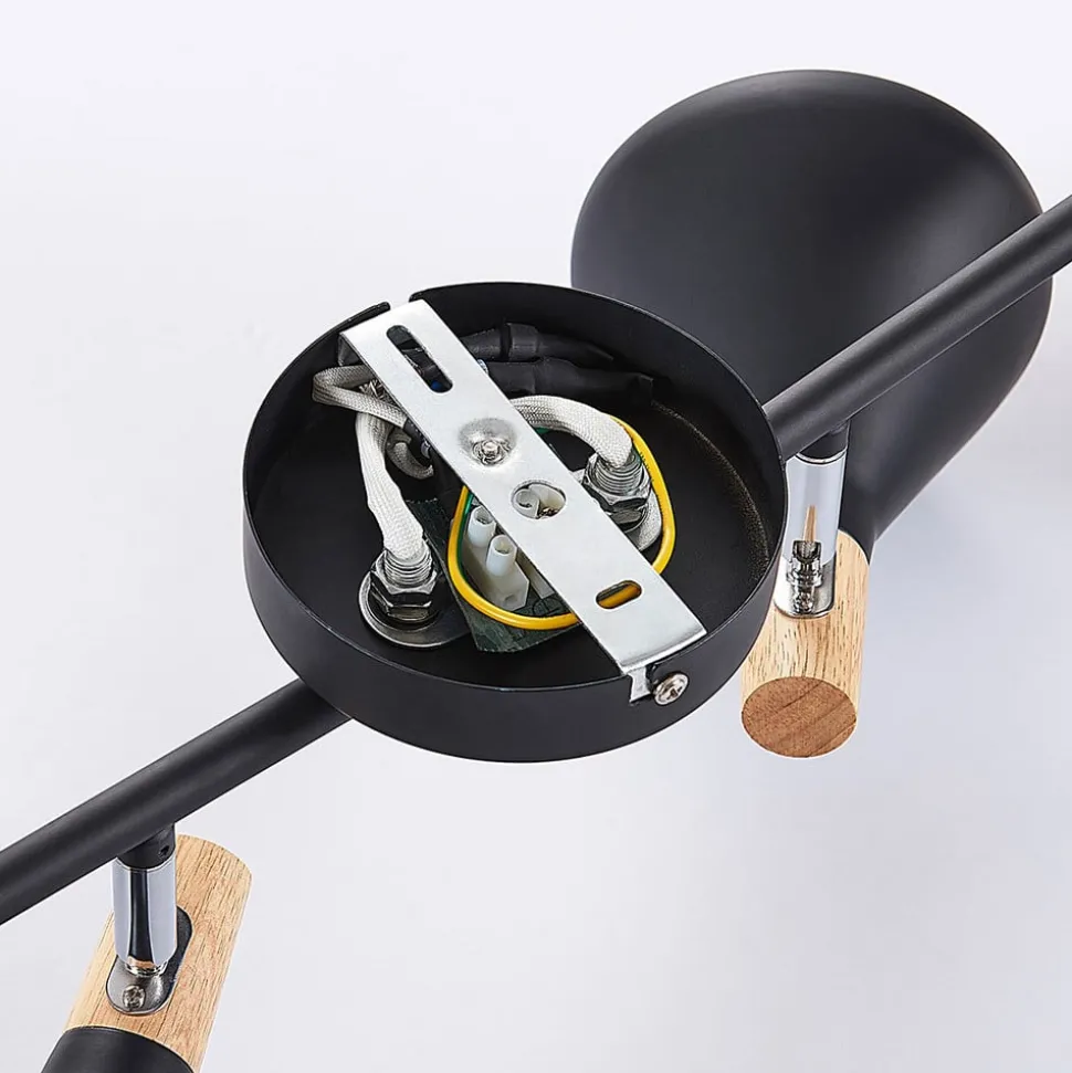 4-lamps Arina plafondspot met zwart metalen kappen en decoratieve houten toepassingen Deze plafondspot heeft vier zwart metalen kappen die allemaal afzonderlijk kunnen worden bewogen zodat het lichtpatroon optimaal kan worden aangepast. Aan de bovenkant eindigen de kappen met een houten element dat harmonieus contrasteert met het zwarte metaal en het uiterlijk breekt. De 4-lamps versie van de plafondspot kan een goede verlichting bereiken en is bijzonder geschikt voor keukens en woonkamers, maar ook voor elke andere kamer.