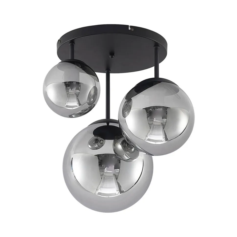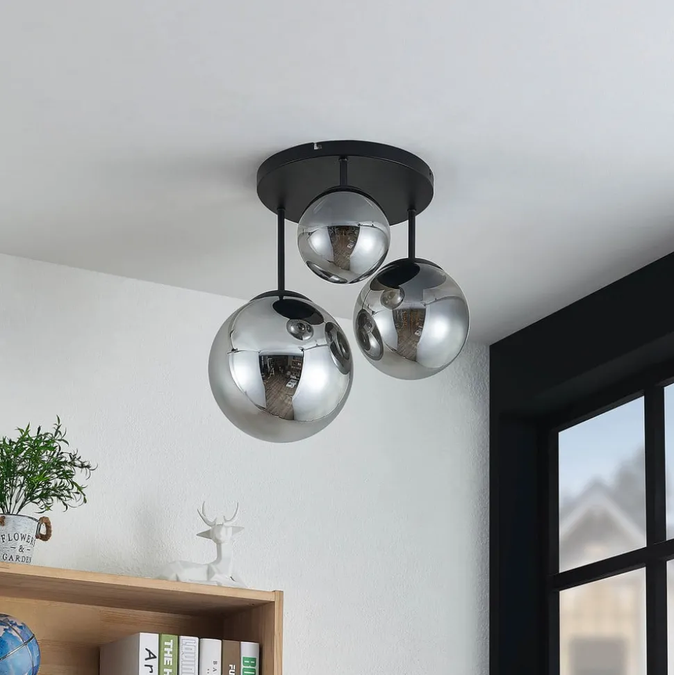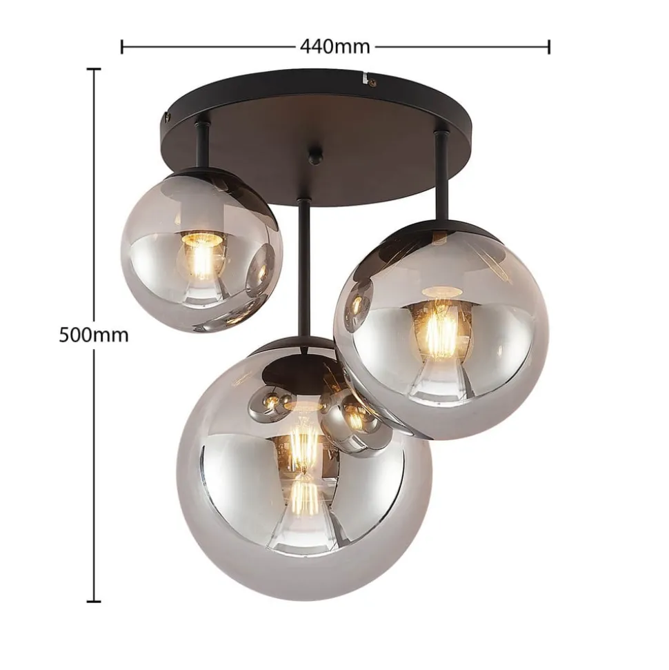 3-lamps Teeja plafondlamp met heldere glazen bollen in rookgrijs Deze plafondlamp is een mooie lichtbron voor de woonruimte die aangenaam licht geeft en een stijlvolle uitstraling heeft. De lamp heeft een 3-lamps ontwerp en is uitgerust met drie glazen bollen van verschillende grootte, die op verschillende hoogtes zitten en een rookgrijze tint hebben, wat niet alleen het uiterlijk maar ook het lichteffect versterkt. De lampen zijn duidelijk zichtbaar in de plafondlamp en moeten daarom ook worden gekozen met hun uiterlijk in gedachten, zodat het geheel er bijzonder harmonieus en stijlvol uitziet. De eigenschappen van plafondlamp Teeja maken haar ideaal voor het verlichten van een woonkamer, maar ze kan ook worden gebruikt in een hal en combineert een mooie gloed met een goede helderheid, die natuurlijk ook afhangt van de keuze van de lampen.