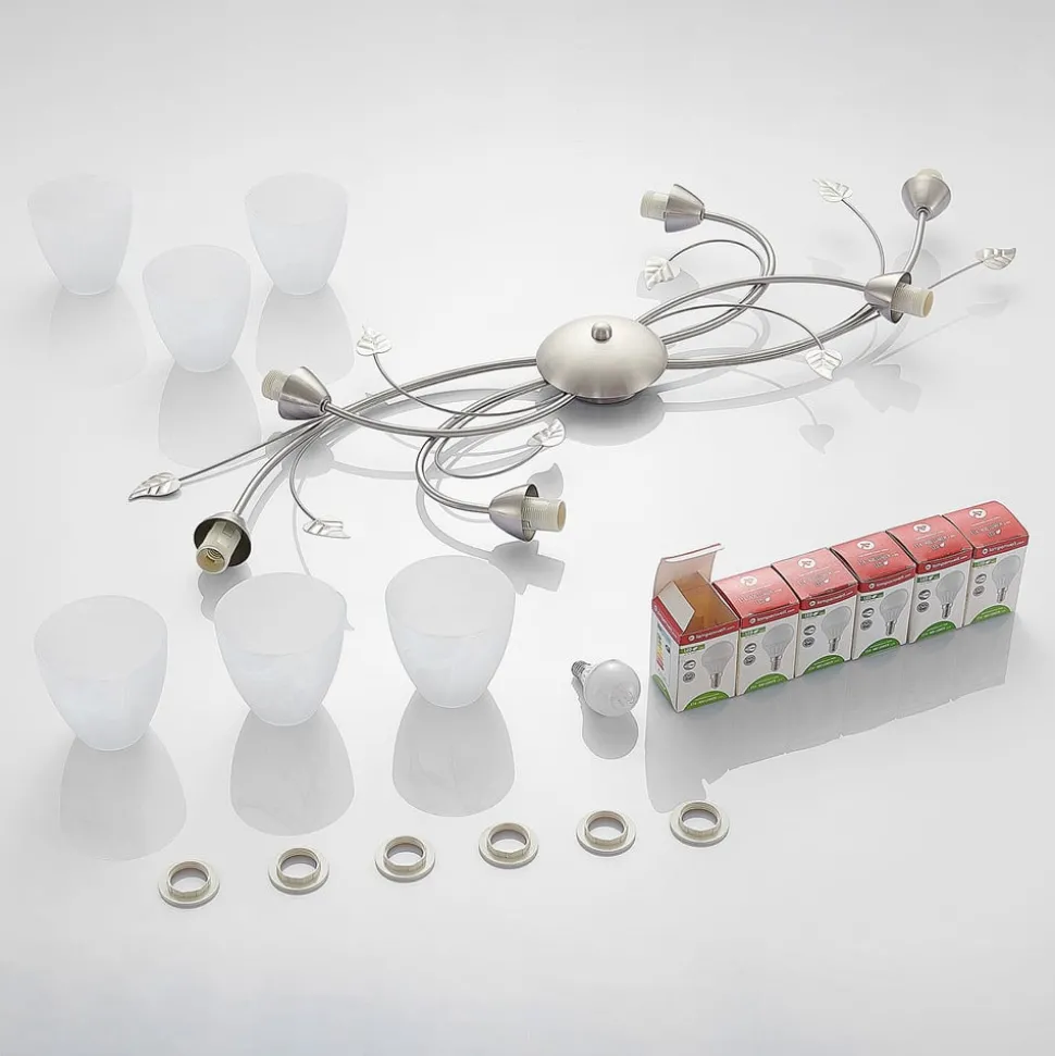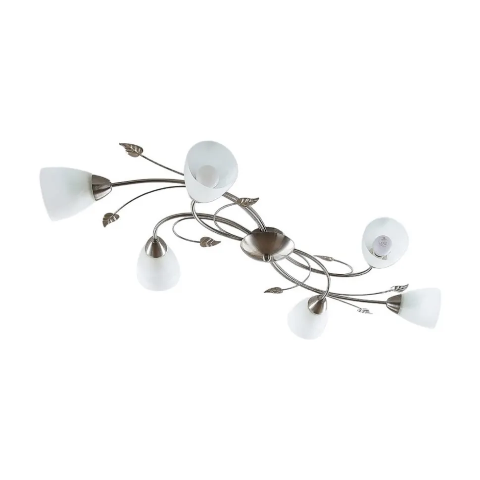 Yannie – elegant gebogen plafondlamp, 6-lamps De moderne plafondlamp Yannie is ideaal voor sfeerverlichting in moderne woonruimtes. Met zijn zes fittingen, die kunnen worden uitgerust met bijpassende lampen, straalt de Yannie-armatuur een aangenaam, gelijkmatig en niet-verblindend licht de kamer in. Het metalen frame is afgewerkt in gesatineerd nikkel en wordt aangevuld door contrasterende witte, licht gemarmerde glazen kappen. Deze zitten aan de bovenkant van elegant gebogen lampenarmen, die decoratief zijn versierd zonder bladeren.