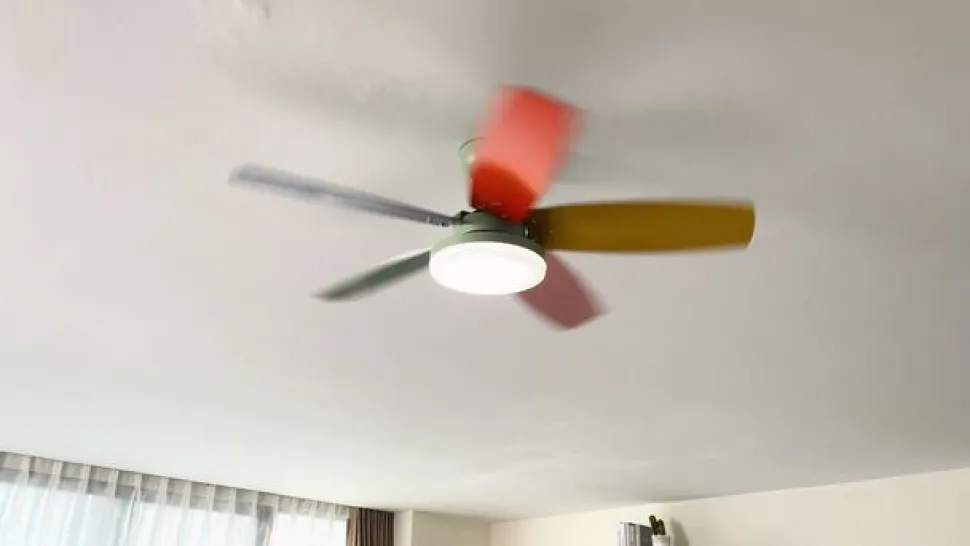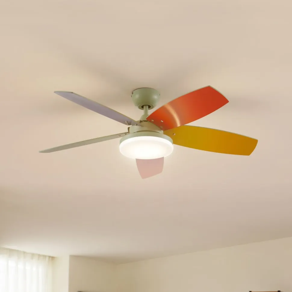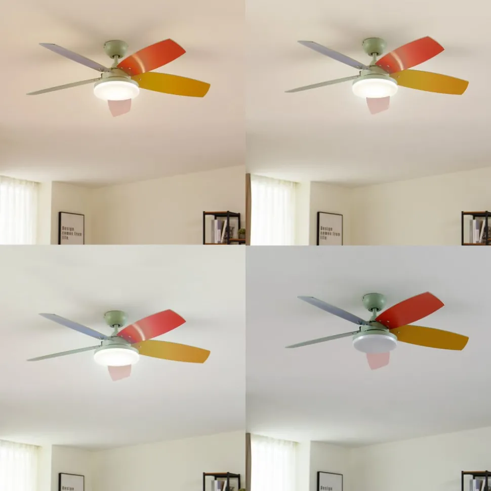 Jonte plafondventilator met kleurrijke ventilatorbladen en praktische CCT-functie De Jonte LED plafondventilator combineert een speelse, frisse look met functionele verlichting en creëert een sfeer die zowel verkwikkend als ontspannend is. Met de regelbare lichtkleur (CCT) kan het licht worden aangepast van warme tinten voor een gezellige avondstemming tot koelere nuances die concentratie en activiteit bevorderen. De geïntegreerde LED lichtbron zorgt niet alleen voor energiezuinige verlichting, maar is ook uitgerust met een geïntegreerde dimmer waarmee de helderheid individueel kan worden geregeld. Dit verlichtingselement is een ideale keuze voor woonkamers, eetkamers en slaapkamers, waar het een fris accent toevoegt met zijn moderne ontwerp en kleurrijke kleurenschema. De Jonte plafondventilator met LED-verlichting vertegenwoordigt een moderne en jonge wooncultuur die waarde hecht aan stijl en functionaliteit. Ervaar hoe licht en beweging harmonieus op elkaar inwerken en elke kamer een speciaal tintje geven. Technische gegevens – gelijkstroommotor – 4 W bij 99 tpm – 29,2 W bij 130 tpm – 40 W bij 163 tpm – luchtcirculatie 60/85/146,8 m³/min – optimale kamergrootte 7-12 m² – geluidsvermogen 53 dB (A) – incl. afstandsbediening (excl. batterijen)
