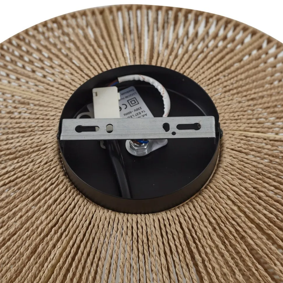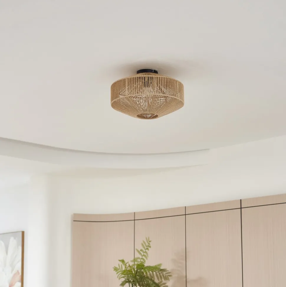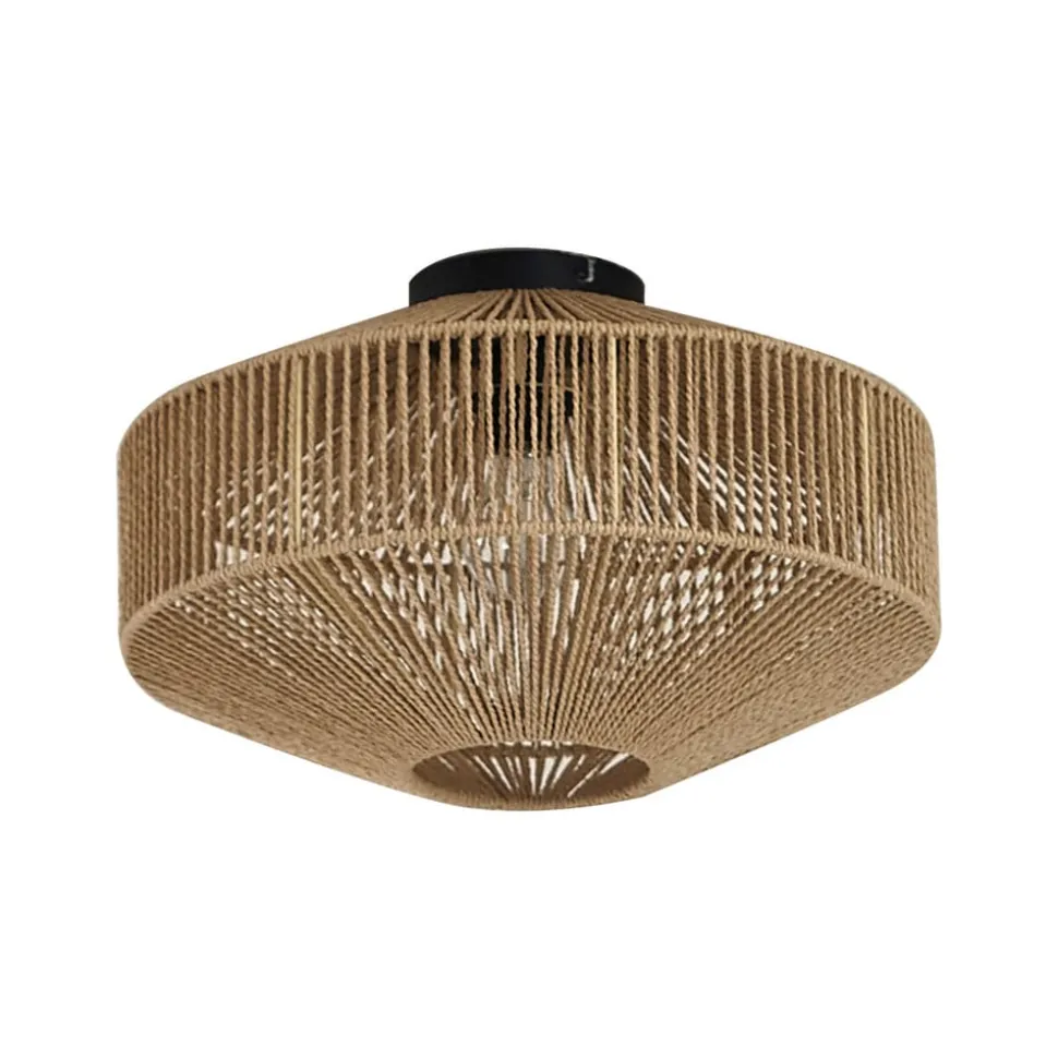 Sorino plafondlamp met gevlochten papieren koord – rustiek ontwerp voor je eigen vier muren De Sorino plafondlamp combineert robuust ijzer met papier en creëert zo een rustieke sfeer die woonkamers, eetkamers en gangen in een warm licht baadt. De combinatie van materialen en de landhuisstijl van de lamp creëren een gezellige sfeer die uitnodigt om te blijven hangen. De plafondlamp kan worden uitgerust met dimbare lampen (niet inbegrepen), waardoor flexibele verlichting mogelijk is. Deze plafondlamp verandert elke kamer in een oase van ontspanning en welzijn.
