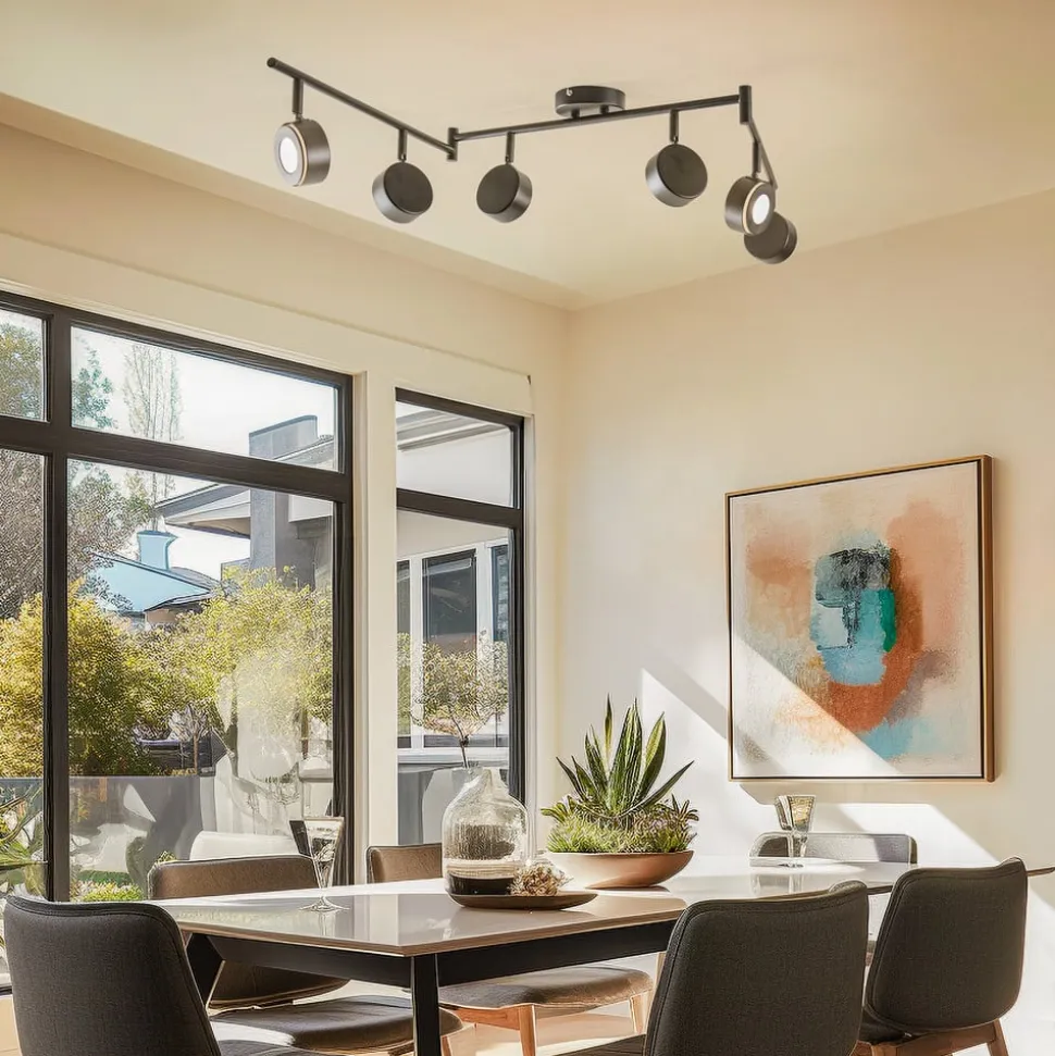 Dimbare Jyla spot met zes verstelbare kappen De 6-lamps plafondspot Jyla is gemaakt van ijzer en geeft de omgeving een geraffineerd accent met zijn zwarte buitenkant. Tegelijkertijd past hij moeiteloos in verschillende woonruimtes dankzij het discrete ontwerp. Hij is bijvoorbeeld ideaal voor gebruik als lichtbron in de gang, keuken, woonkamer of eetkamer. Het frame kan op drie plaatsen worden versteld en de ronde kappen kunnen ook flexibel worden gekanteld en gedraaid. Hierdoor kan het licht op maat worden aangepast en de ruimte optimaal worden verlicht. Er worden zes GX53 lampen meegeleverd en de lamp kan zoals gebruikelijk met een wandschakelaar worden in- en uitgeschakeld. Dankzij de 3-staps dimtechnologie met geïntegreerde uit-functie kan de lamp ook tot drie verschillende helderheidsniveaus worden gedimd door meerdere keren op de schakelaar te drukken: 100 %, 50 % en 12 %.