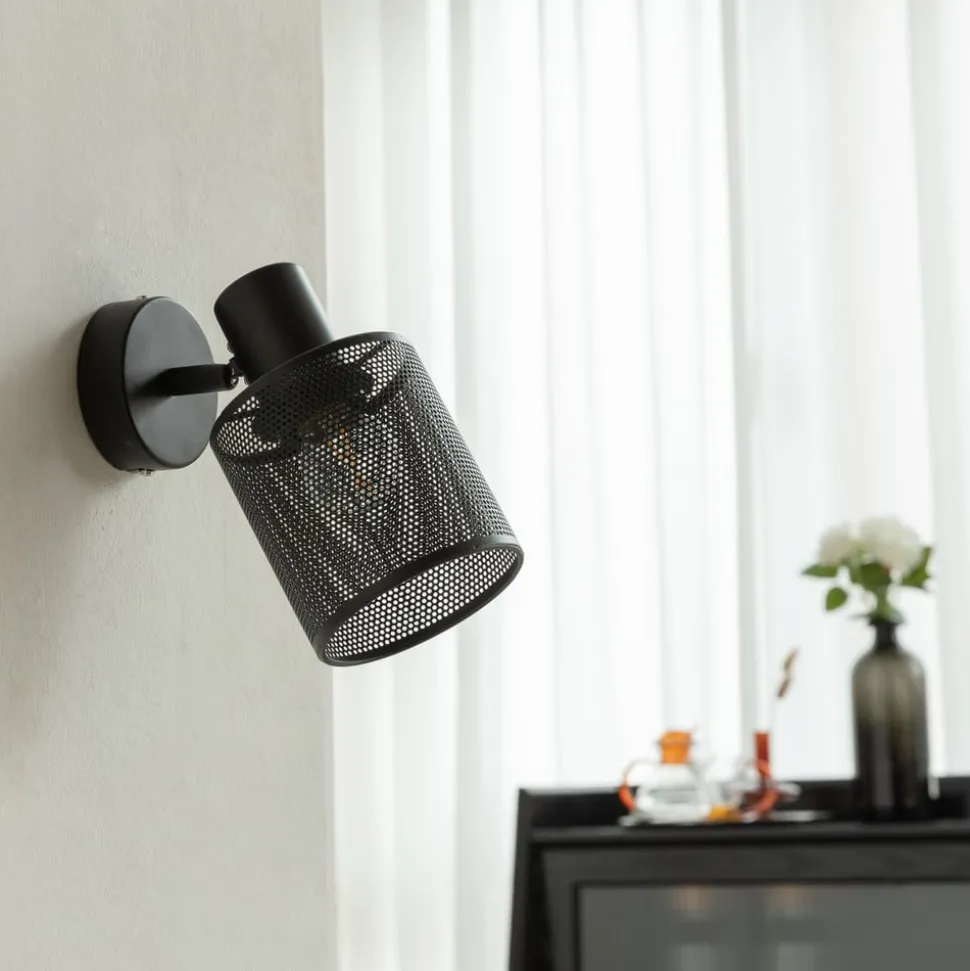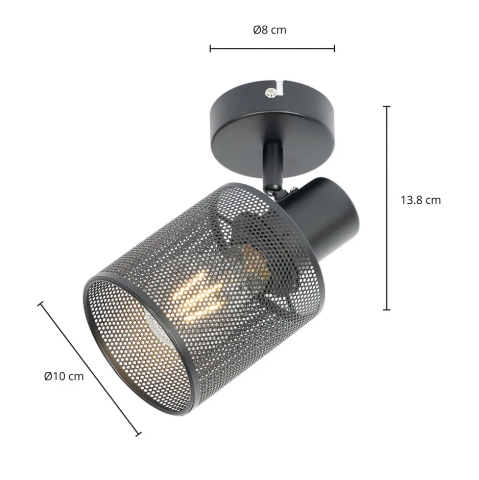 Zwarte spot Stancho met cilindrische ijzeren kap in geperforeerde plaatlook Stancho is een spot die op verschillende manieren gebruikt kan worden en geschikt is voor zowel wand- als plafondmontage. De spot kan naar wens worden gedraaid en gezwenkt en heeft een cilindrische kap die niet uit één stuk is gemaakt, maar is ontworpen met een soort gaaslook, omdat hij bestaat uit een geperforeerd plaatmetalen element dat het licht weliswaar enigszins dimt, maar toch voldoende licht doorlaat om effectief in de omgeving te schijnen. Het volledig zwarte oppervlak ziet er elegant uit en kan bijzonder goed worden geïntegreerd in tal van moderne stijlen.