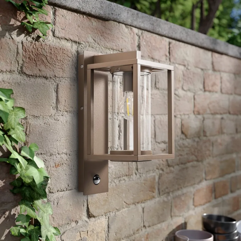 Opvallende buitenwandlamp Ferda van bruin aluminium met praktische bewegingsmelder De buitenwandlamp Ferda combineert modern design met rustieke charme en biedt een ideale verlichtingsoplossing voor buitenruimtes zoals terrassen en balkons. Uitgerust met een intelligente sensor reageert deze hanglamp in bruin op beweging en verlicht de buitenruimte wanneer dat het meest nodig is. De lamp is niet dimbaar, maar de helderheid kan worden aangepast door de lamp en een externe dimmer (niet inbegrepen) te selecteren. Met zijn stijlvolle uiterlijk en praktische sensorfunctie creëert de Ferda een uitnodigende sfeer in de buitenruimte. Technische gegevens sensor – Verlichtingsinstelling tussen 20-200 lux – Detectiebereik 6-10m – Detectiehoek 120°