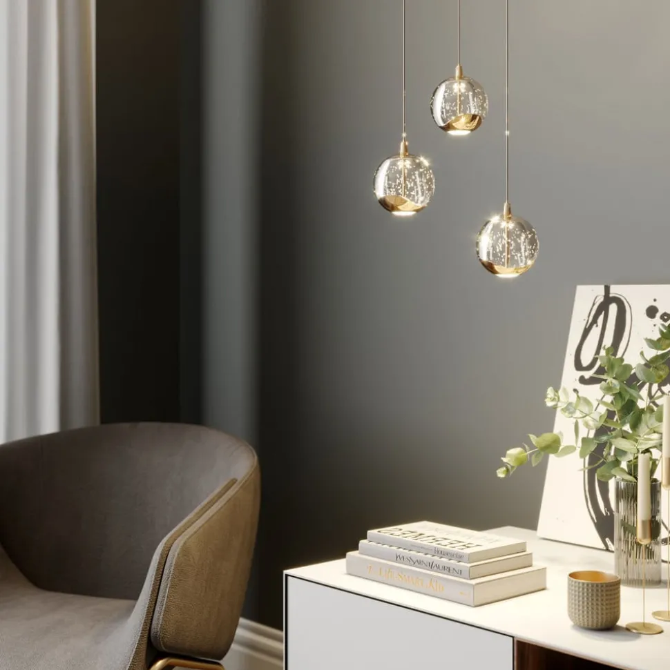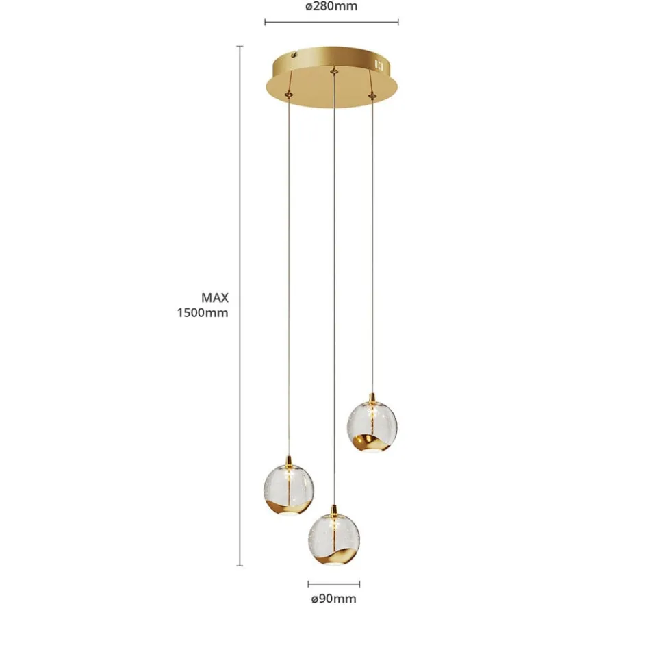 Hayley LED hanglamp met drie glazen bollen en metalen elementen in glanzend goud De 3-lamps versie van Hayley past goed boven een eettafel en maakt indruk met een speciale glamourfactor, die wordt gevormd door het stralend sprankelende bubbelglas en de metalen elementen in goud. De kappen hebben een compact ontwerp en zijn allemaal bolvormig. Het grootste deel is gemaakt van het aantrekkelijke bubbelglas, maar aan de onderkant zit een metalen element in een glanzende goudtint, terwijl de directe lichtuitstraling aan de onderkant zachter en gelijkmatiger is dankzij een element van wit glas, dat nauwelijks schittering creëert. Een echte HighLight met opvallende kwaliteiten!