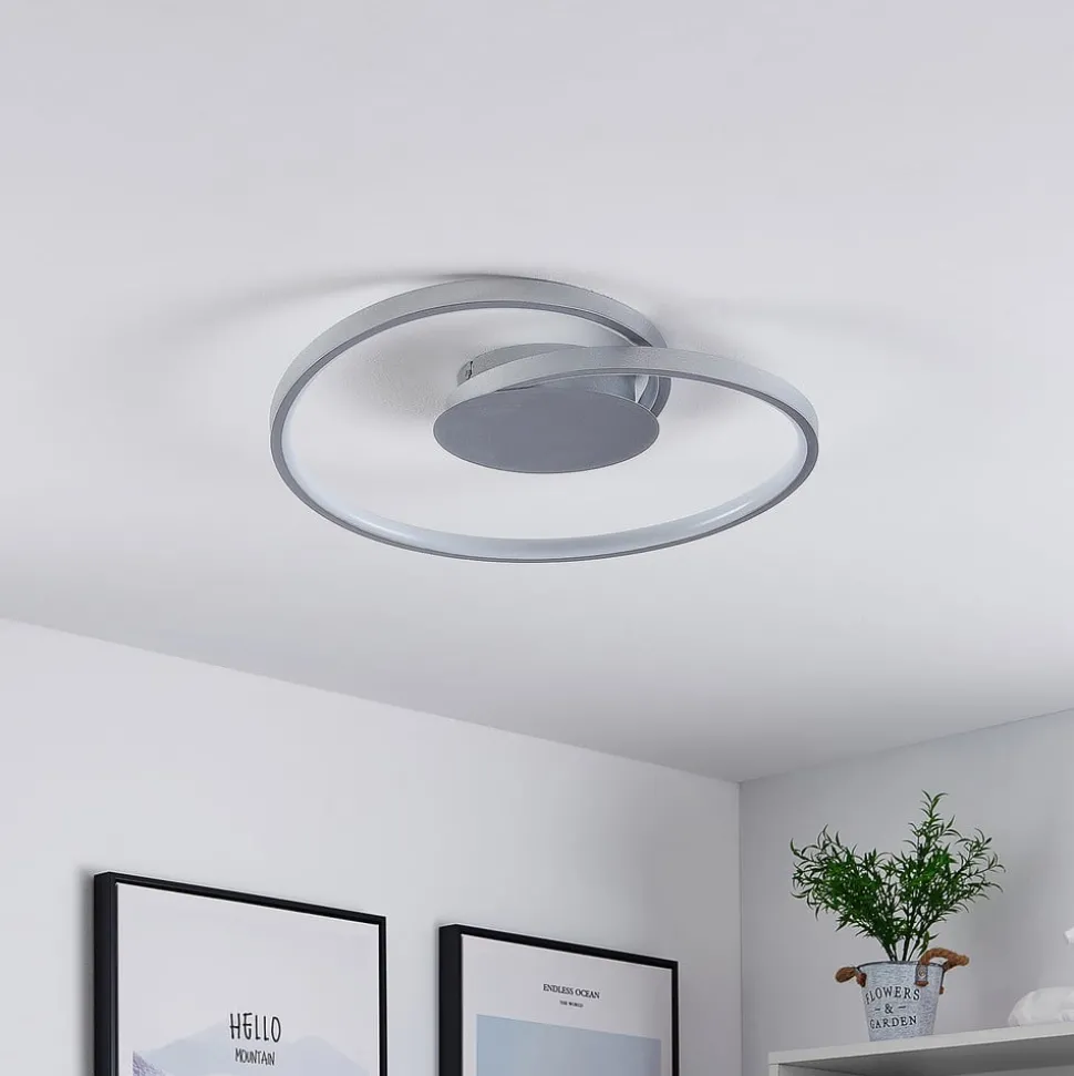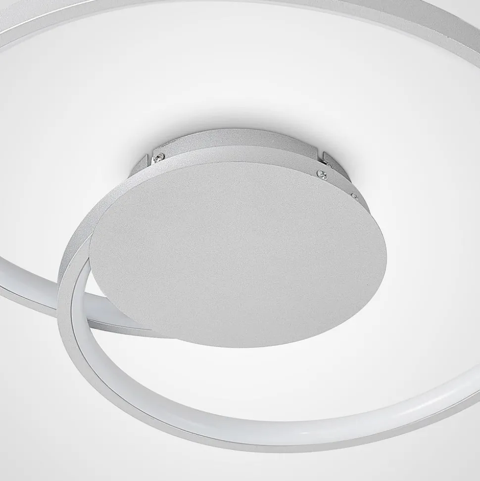 Enesa ronde LED plafondlamp van aluminium en ijzer in zilver De Enesa LED plafondlamp heeft een stijlvol en praktisch karakter. Vanuit een ronde plafondhouder komt een smalle stang die één keer in een cirkel beweegt om een aantrekkelijk patroon te creëren. Langs deze stangen lopen vaste LED’s en hun helderheid kan worden gedimd met de wandschakelaar. Met behulp van de 4-staps dimtechnologie en de normale uit-functie kan de armatuur tot 100%, 60%, 30% en 13% van zijn gebruikelijke helderheid worden gedimd en zoals gewoonlijk worden in- en uitgeschakeld. Dit gebeurt door meerdere keren op de wandschakelaar te drukken. Het moderne ontwerp van de Enesa LED plafondlamp zet stijlvolle accenten op vlakke plafonds en ziet er bijzonder goed uit in een woon- of slaapkamer.