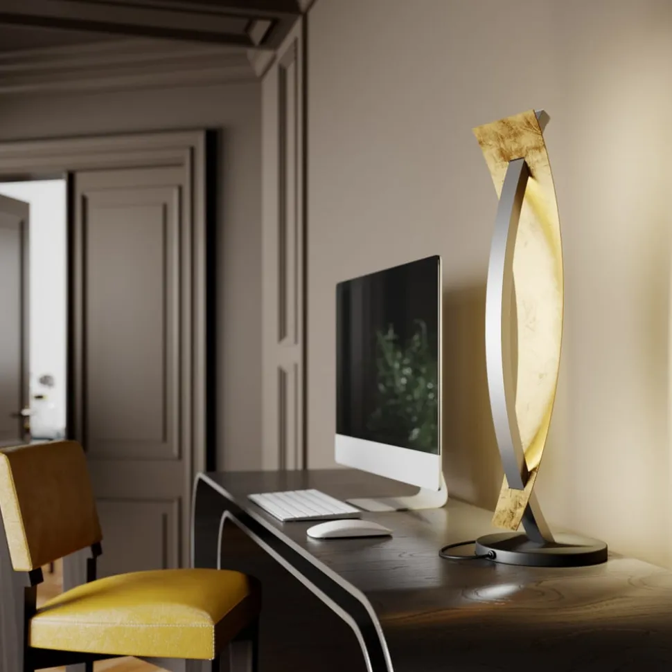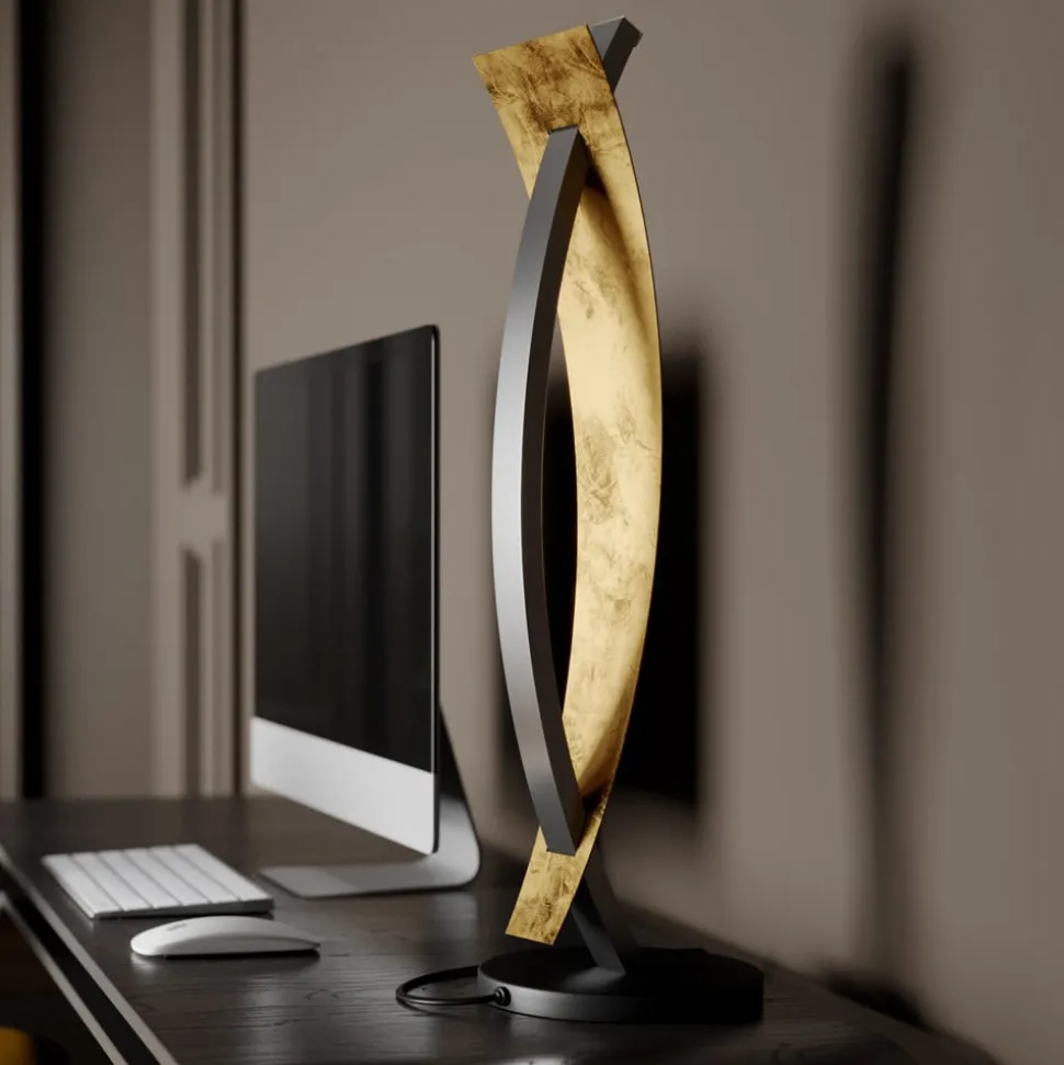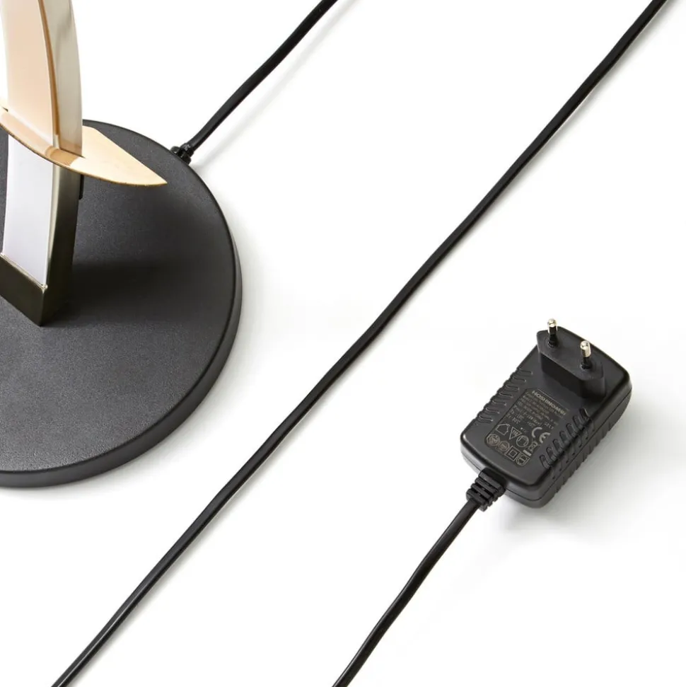 Een goudkleurige en zwarte lichtbron: de LED tafellamp Marija, dimbaar Zodra de LED lamp in de Marija tafellamp wordt ingeschakeld, baadt de tafel of het dressoir in warmwit licht. De LED tafellamp Marija is echter veel meer dan alleen een pragmatische tafellamp. Ze maakt indruk met haar organische vorm, die vakkundig bijdraagt aan de decoratie van een elegant ingerichte kamer. Een licht gebogen lichtbuis komt uit de ronde voet en ondersteunt een smalle metalen kap in zwart. Deze is in tegengestelde richting gebogen. De tafellamp kan in drie fasen worden gedimd voor meer comfort in de woon- of slaapkamer.