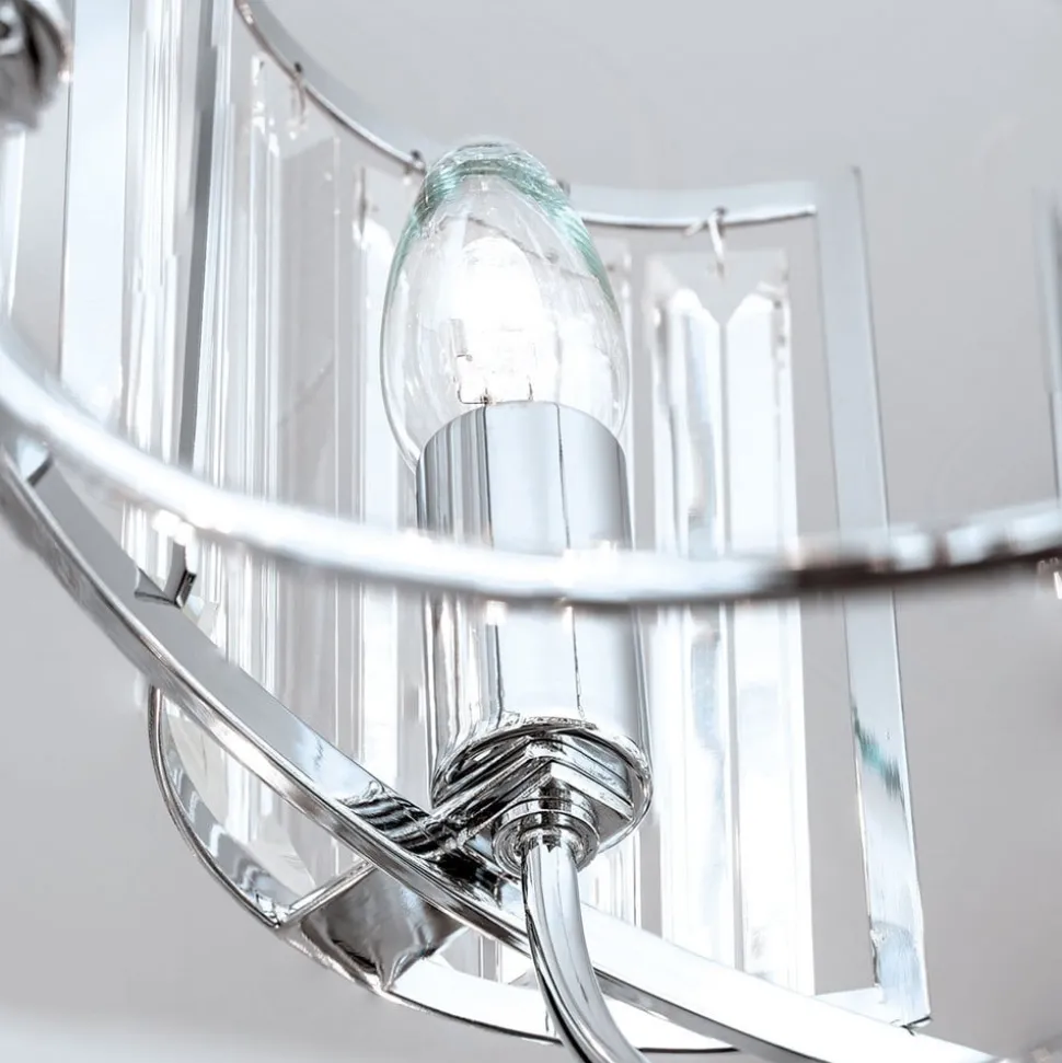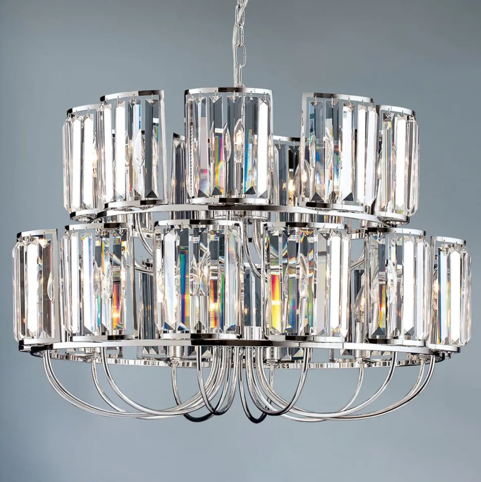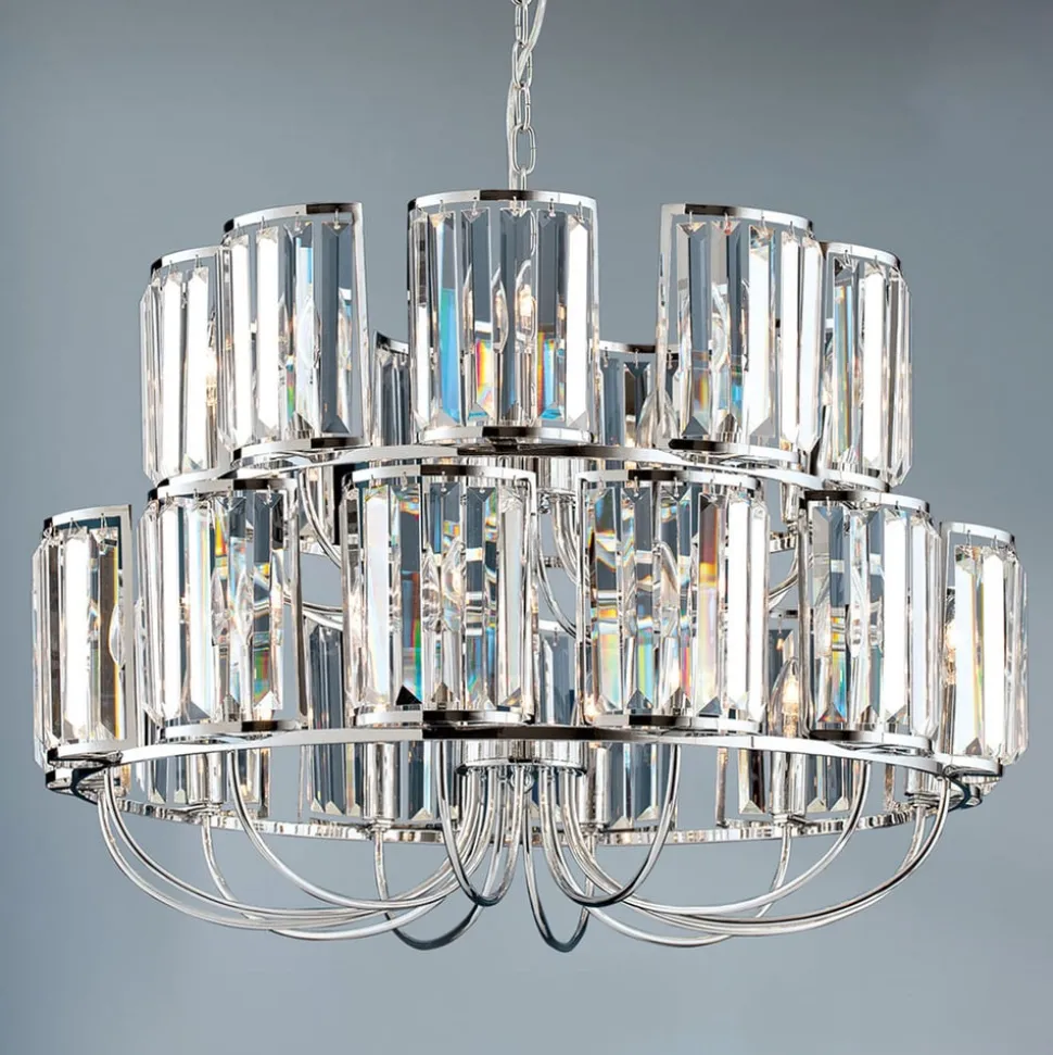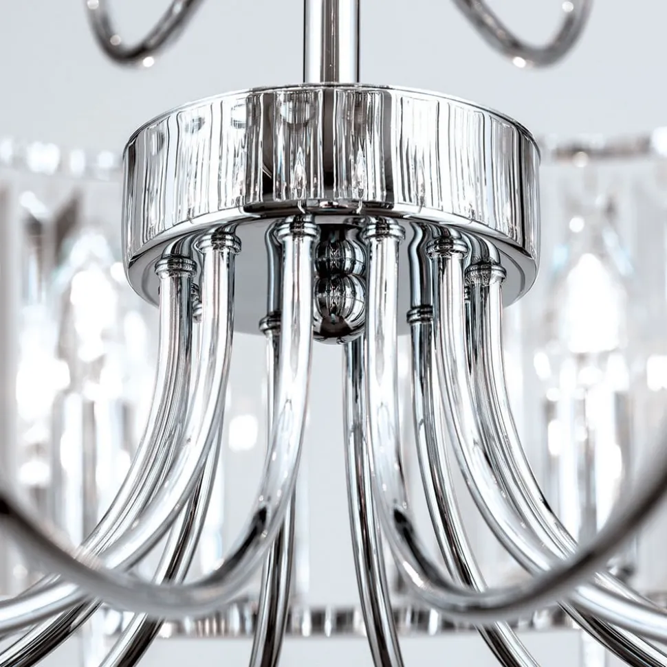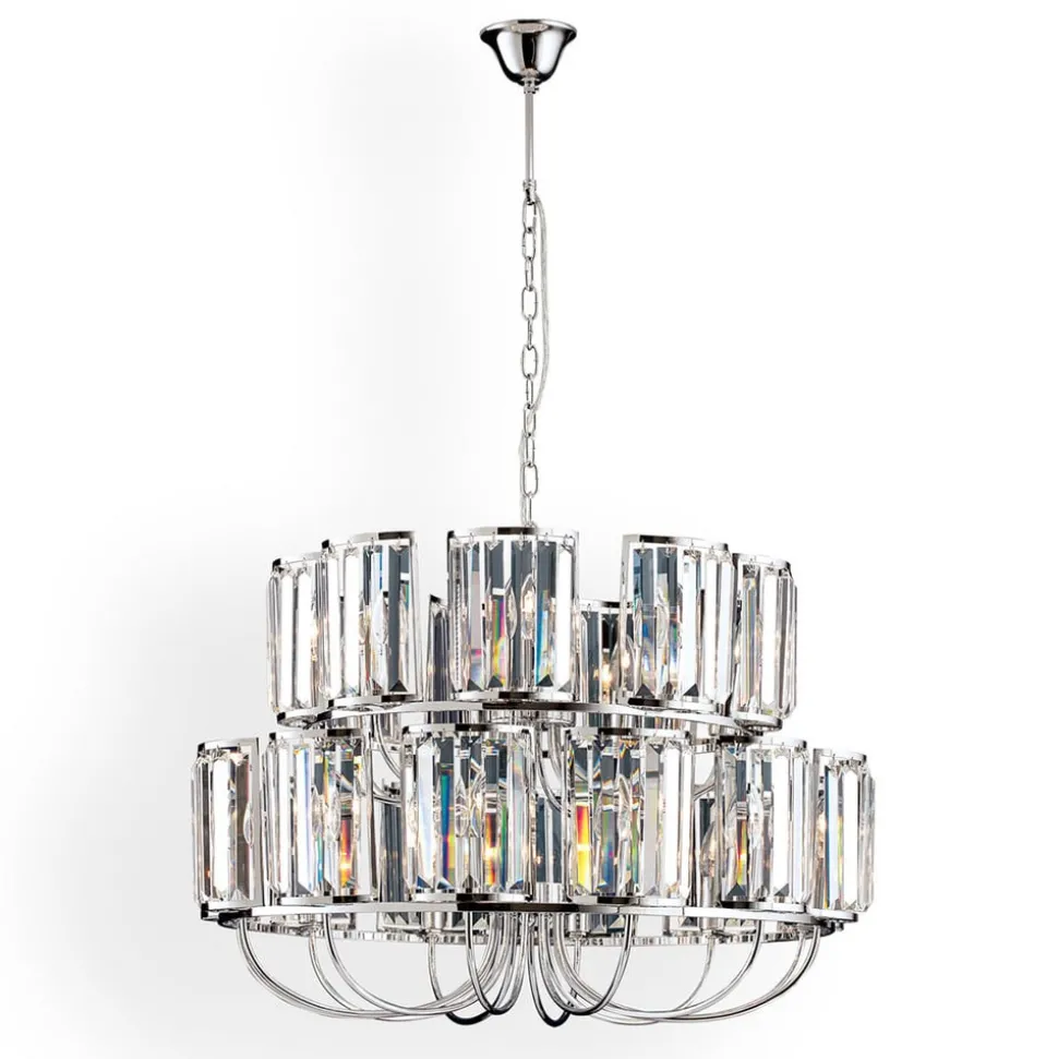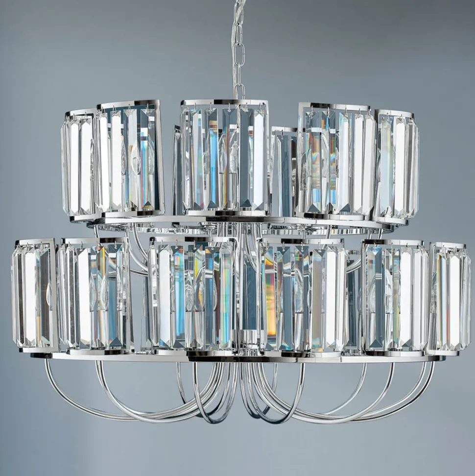 De Gstaad kroonluchter is uitgerust met in totaal 21 lichtbronnen op twee verdiepingen, die het weelderige gordijn van K9-kristallen perfect afsteken. De metalen elementen van de kroonluchter zijn glanzend verchroomd, wat het schitteringseffect nog versterkt.