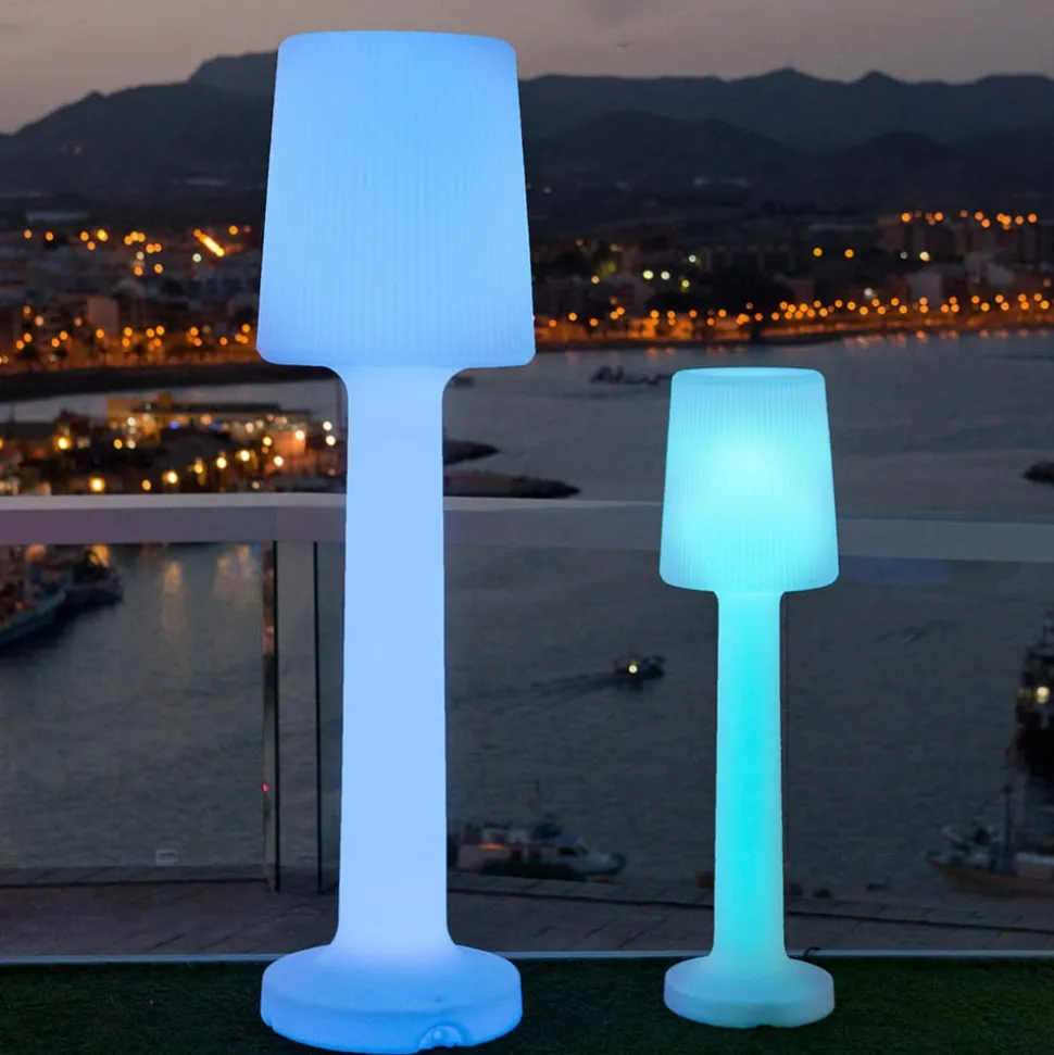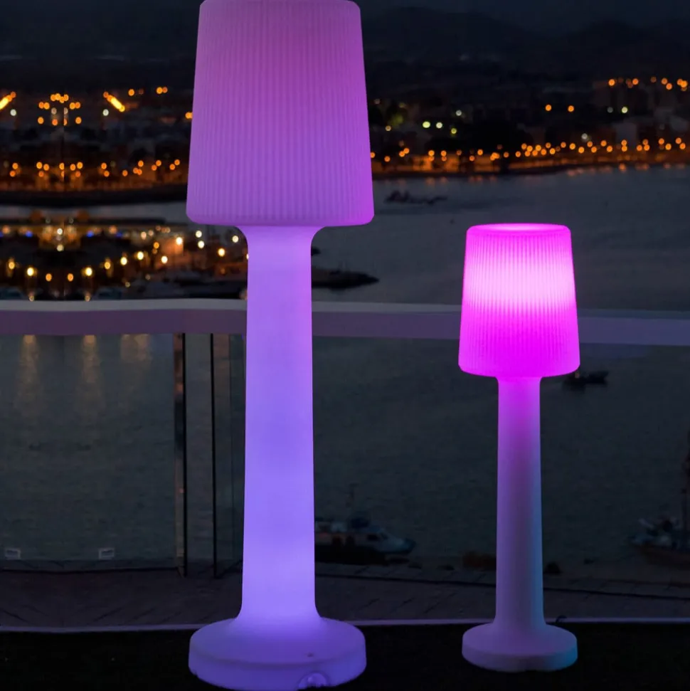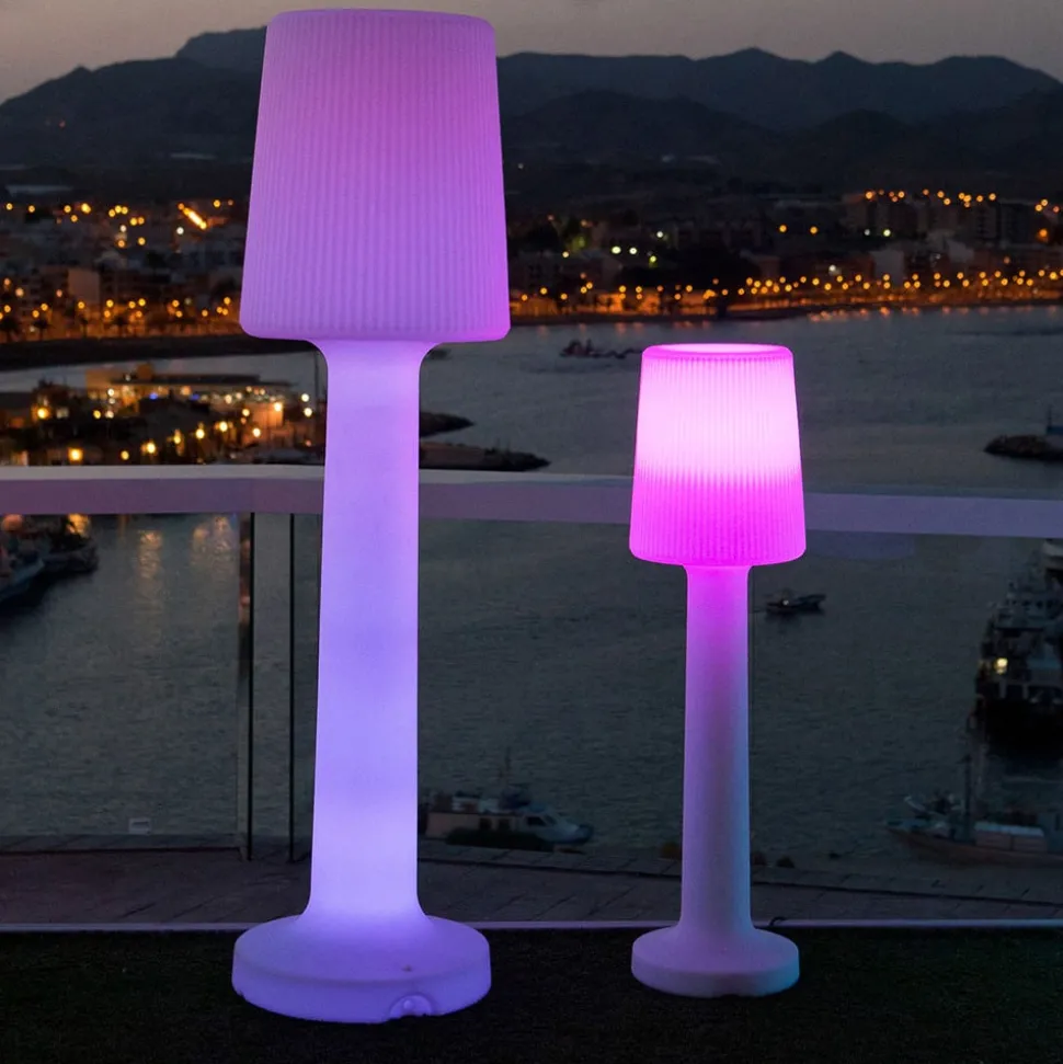 Witte LED vloerlamp Carmen met oplaadbare batterij voor binnen en buiten De op batterijen werkende LED vloerlamp Carmen biedt een breed scala aan verlichtingsmogelijkheden en kan volledig onafhankelijk overal buiten of binnen worden gebruikt, want als de batterij is opgeladen, brandt deze 8 tot 12 uur. Alleen dan moet de batterij worden opgeladen via het lichtnet. De hiervoor benodigde USB-oplaadkabel wordt meegeleverd (zonder netadapter). In de lamp zijn gekleurde en witte LED’s geïnstalleerd. Deze kunnen worden bediend met de meegeleverde afstandsbediening en het licht kan ook worden gedimd. De Carmen decoratieve LED vloerlamp is een product van de Spaanse verlichtingsfabrikant Newgarden, die gespecialiseerd is in decoratieve en innovatieve buitenverlichting. Alle producten van Newgarden zijn gemaakt van polyethyleen, een kunststof die wordt gekenmerkt door zijn UV-bestendigheid en zijn vermogen om extreme temperaturen te weerstaan. Uitgerust met beschermingsgraad IP54 kan stof noch spatwater het armatuur binnendringen. De kap van de Carmen LED vloerlamp steekt mooi af tegen de voet van het armatuur dankzij het rondom gegroefde oppervlak – Oplaadbare batterij 1 x 3.600 mAh lithium