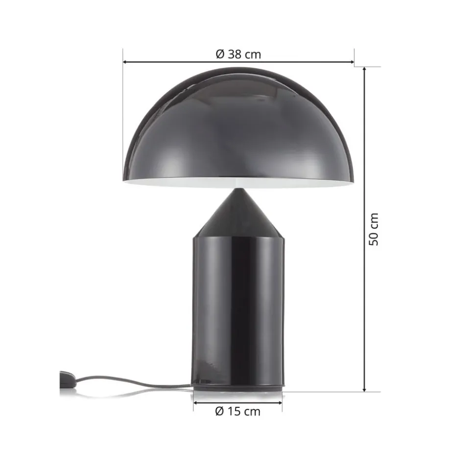 Door de naar beneden gerichte kapopening schijnt het licht, dat innes wordt gegenereerd door twee E27 lampen (exclusief), direct op het tafeloppervlak, waardoor een indirecte en zeer gezellige verlichting ontstaat. Een bijzonderheid hierbij is dat de lichtsterkte individueel kan worden aangepast met behulp van de geïntegreerde dimmer. Das Atollos design is in de loop der jaren een archetype van de verlichtingswereld geworden en wordt daarom tentoongesteld in talrijke musea, zoals het Museum of Modern Art in Philadelphia, het Kunstgewerbe Museum in Zurich, het Compasso d’Oro Adi in Italië en nog veel meer.