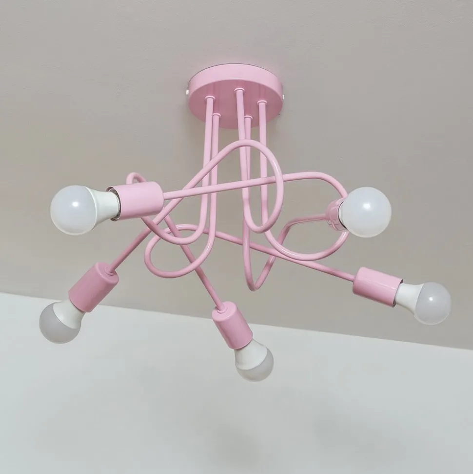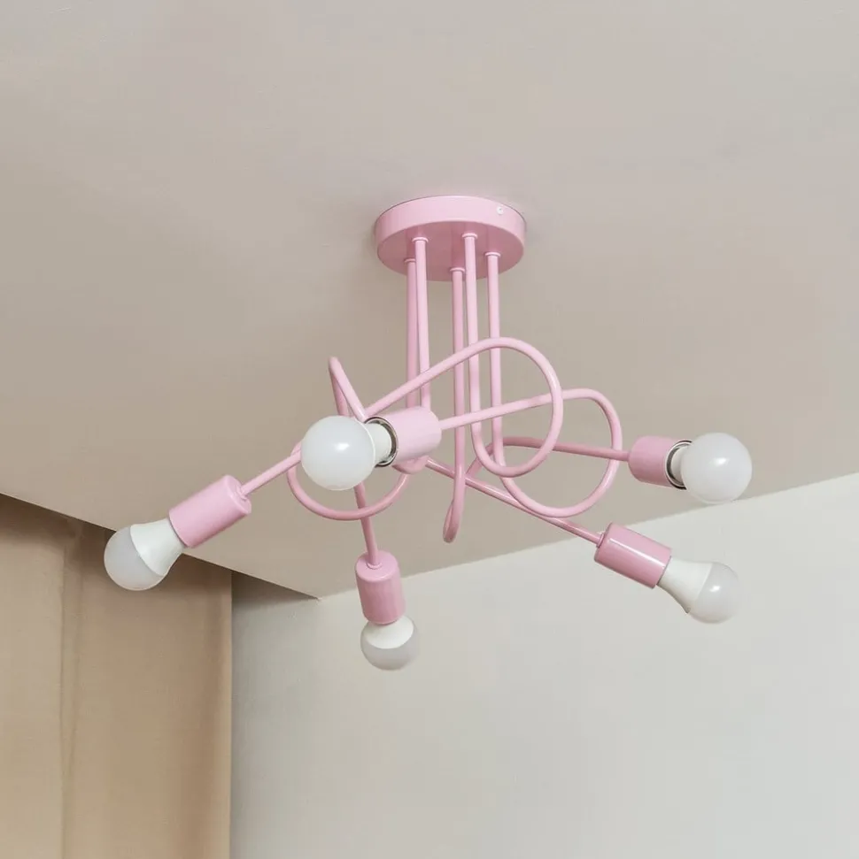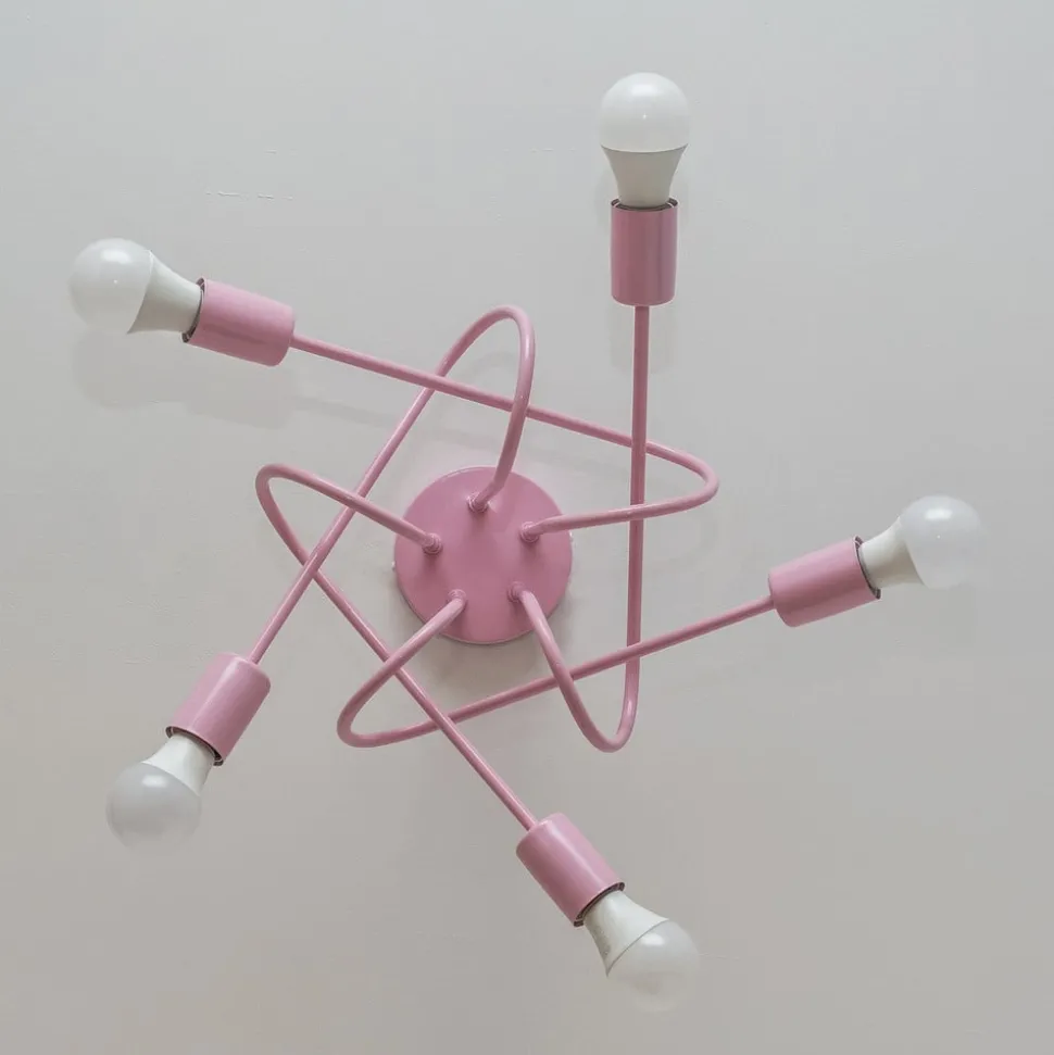 5-lamps Oxford plafondlamp in lichtroze De Oxford metalen plafondlamp combineert stijlvol design met functionele verlichting. De vijf lampenarmen reiken vanuit de ronde baldakijn naar beneden in de ruimte en wijzen in verschillende richtingen, zodat zelfs grote ruimtes helder verlicht worden vanuit elke hoek met deze plafondlamp. De Oxford plafondlamp is uitgerust met een gestandaardiseerde E27 fitting en maakt het mogelijk om de LED plafondlamp eenvoudig te vervangen, wat bijdraagt aan efficiënt energieverbruik. De robuuste metalen constructie zorgt voor duurzaamheid en past harmonieus in verschillende inrichtingsstijlen. De Oxford plafondlamp is daarom een ideale keuze voor wie waarde hecht aan kwaliteit en esthetische verscheidenheid.