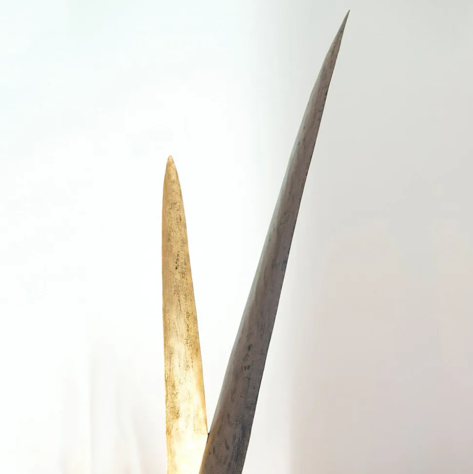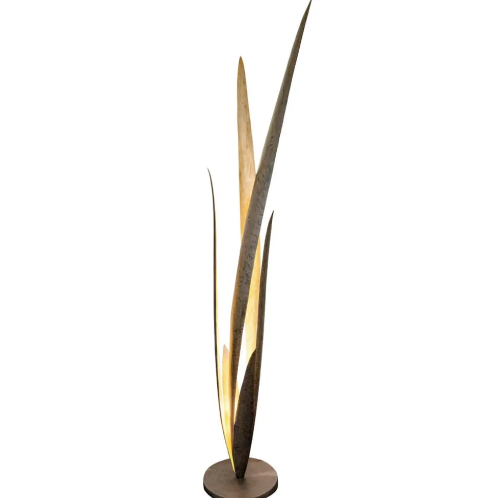 Decoratieve Palustre vloerlamp van ijzerDe bladeren van de Palustre vloerlamp, die de lichtbron binnenin omringen, zien eruit als te grote grassprieten. Ze zijn van verschillende hoogtes, gemaakt in een prachtig bruinzwart design aan de buitenkant en in een warme gouden tint aan de binnenkant en winden omhoog vanaf de ronde voet. De lichtbron (optioneel halogeen of LED lamp met GU10 fitting) zit centraal tussen de bladeren en schijnt op de gouden binnenkant ervan, waardoor unieke lichtreflecties ontstaan. De schakelaar voor gemakkelijke bediening is ingebouwd in de voedingskabel.
