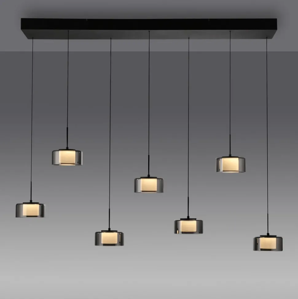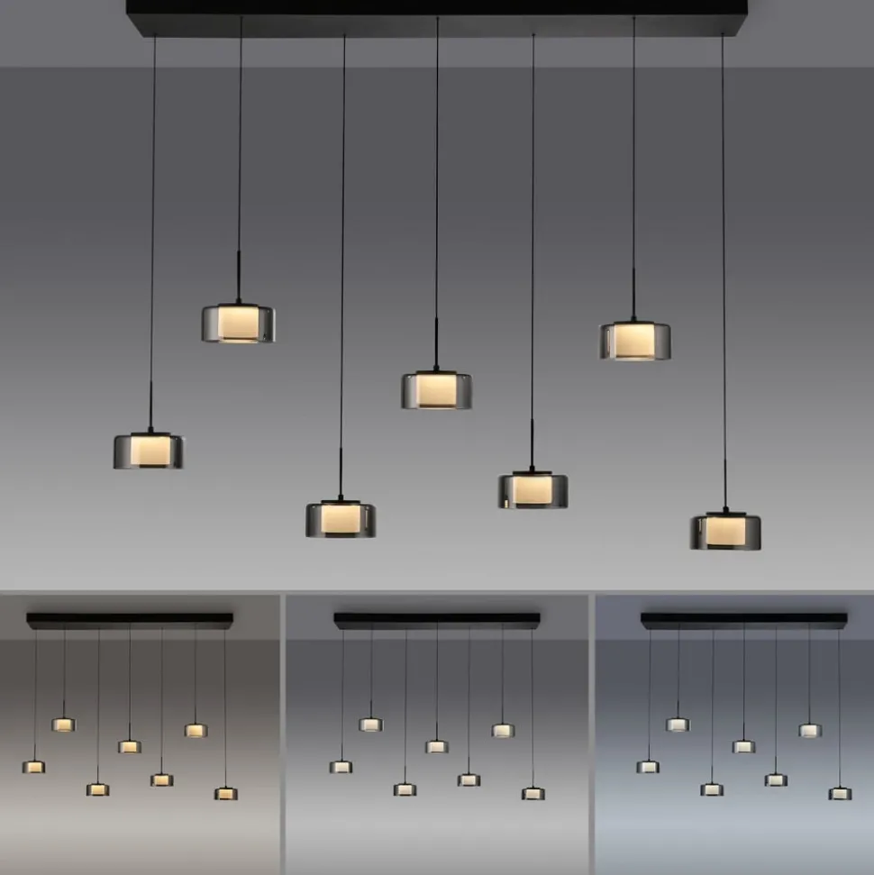 7-lamps LED hanglamp Rika met in hoogte verstelbare pendels, dimbaar via lichtschakelaar De LED hanglamp Rika in zwart maakt indruk met haar moderne en minimalistische ontwerp. Met zeven ruiten van gerookt glas en warmwitte LED lampen geeft ze een zacht licht en creëert ze een uitnodigende sfeer boven de eettafel. Dankzij de Comfort-Lift functie kan de hoogte van de lamp moeiteloos worden aangepast, waarbij het mechanisme in de baldakijn storende contragewichten overbodig maakt. De hoogte van elke hanglamp kan individueel worden ingesteld om zich flexibel aan te passen aan de omstandigheden in de ruimte. De hanglamp is ook uitgerust met SimplyDim-technologie, waarmee de lichtintensiteit eenvoudig kan worden gedimd met de bestaande lichtschakelaar. De lichtsterkte kan met de schakelimpuls traploos worden verlaagd van 100% naar 10%. Als het licht binnen 3 seconden na het uitschakelen weer wordt ingeschakeld, begint het dimproces. Wanneer de maximale (100 %) of minimale helderheid (10 %) is bereikt, blijft het licht ongeveer 2 seconden op deze instelling voordat het proces opnieuw begint. De gewenste helderheid kan worden opgeslagen door uit te schakelen, zodat het licht de volgende keer dat het wordt ingeschakeld op de opgeslagen helderheid schijnt. Deze functie maakt het mogelijk om de lichtsterkte aan te passen aan individuele wensen en snel weer op te roepen. Plaats de hanglamp boven de eettafel en creëer een gezellige sfeer.