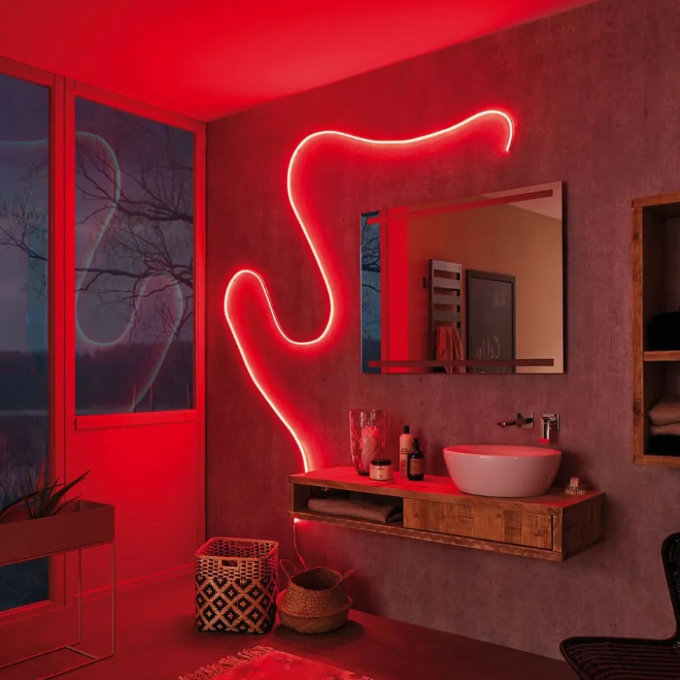 Of het nu in de gang, in de woonkamer of zelfs in de wellnessruimte is – met de MaxLED Flow basisset worden unieke en zeer individuele lichteffecten aan de wand gecreëerd. De MaxLED Strip kan naar wens worden ingekort en kan zowel in rechte als in gebogen lijnen worden geïnstalleerd. Het is zo gegoten dat het profiel nog steeds zeer flexibel is en een grote stralingshoek gegarandeerd is voor een optimale verlichting. Bovendien is de set voorzien van IP67-bescherming, zodat hij ook in badkamers en andere vochtige ruimtes kan worden gebruikt.