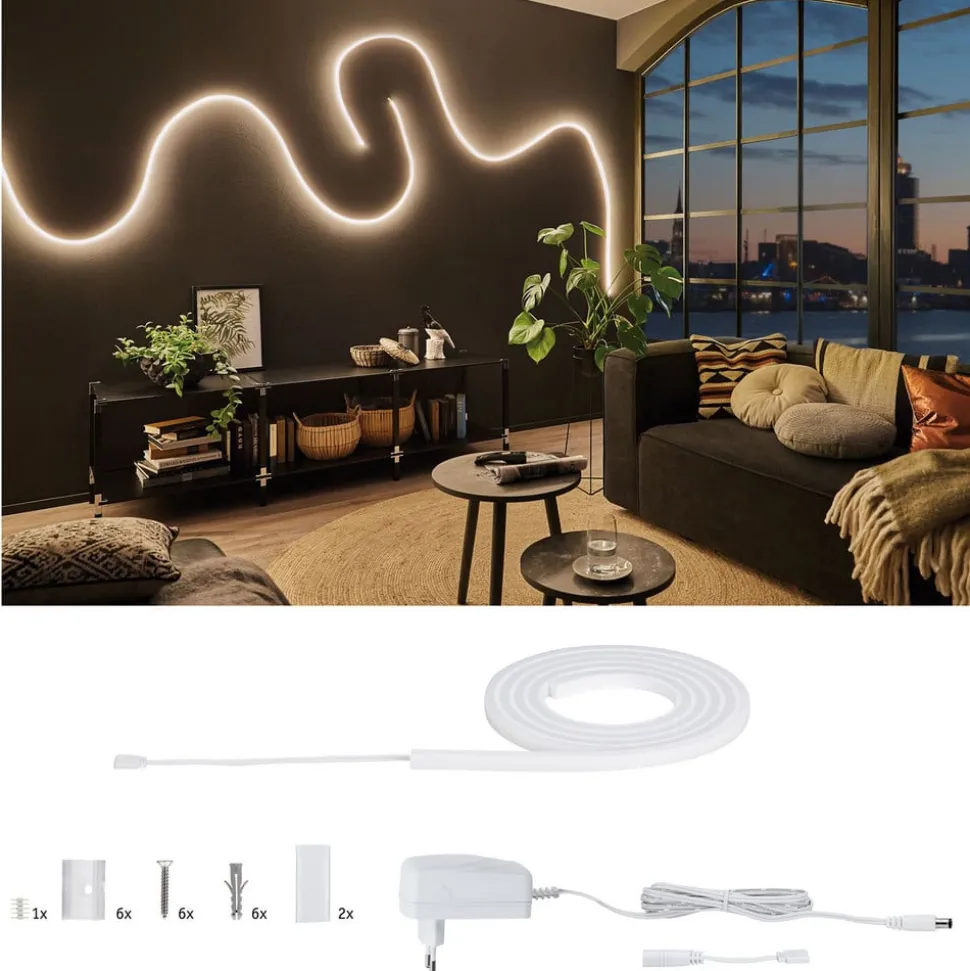 De MaxLED Flow basisset zorgt voor een groot lichtgebied zonder zichtbare LED-punten. De MaxLED Flow is voorzien van een flexibel profiel en gegoten met een brede stralingshoek. Het kan zowel in rechte lijnen als in gebogen lijnen worden gemonteerd. Dit unieke lichtelement is IP67 beschermd, waardoor het zelfs in vochtige ruimtes en wellnessruimtes effectief kan worden vormgegeven. Naast de Strip en Power Supply bevat de set ook de nauwelijks zichtbare, transparante bevestigingsklemmen, schroeven en deuvels.