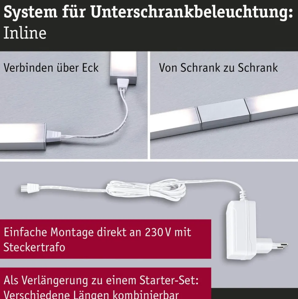 Hedendaagse keukenverlichting – LED meubelverlichting Inline, uitbreidingsset met twee lampen met CCT-functie De LED meubelverlichting Inline is ontworpen voor de functionele verlichting van keukenwerkbladen. Het bestaat uit een slank aluminium profiel en een diffuser met gemakkelijk te reinigen oppervlakken en herbergt LED’s met instelbare lichtkleur – uitbreidingsset met twee lampen, aansluitkabel, montagemateriaal – ontworpen als aanvulling op een startset (tot een maximaal totaal vermogen van 24 W) – zonder voedingseenheid, zonder schakelaar – bediening alleen mogelijk in combinatie met een Inline startset!