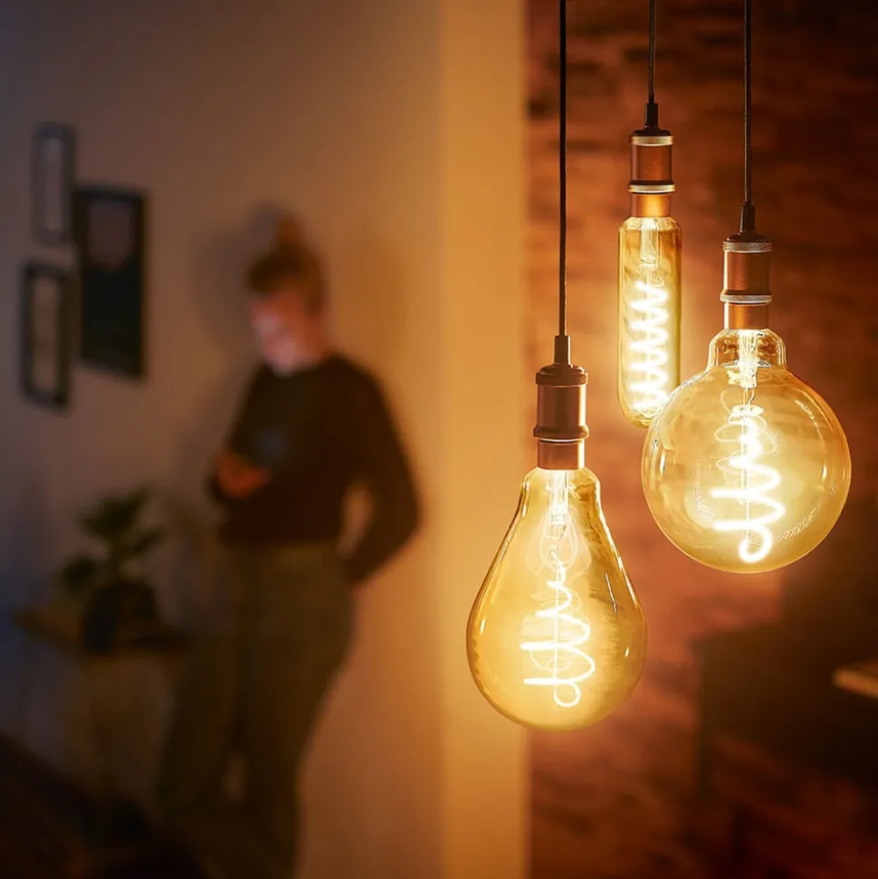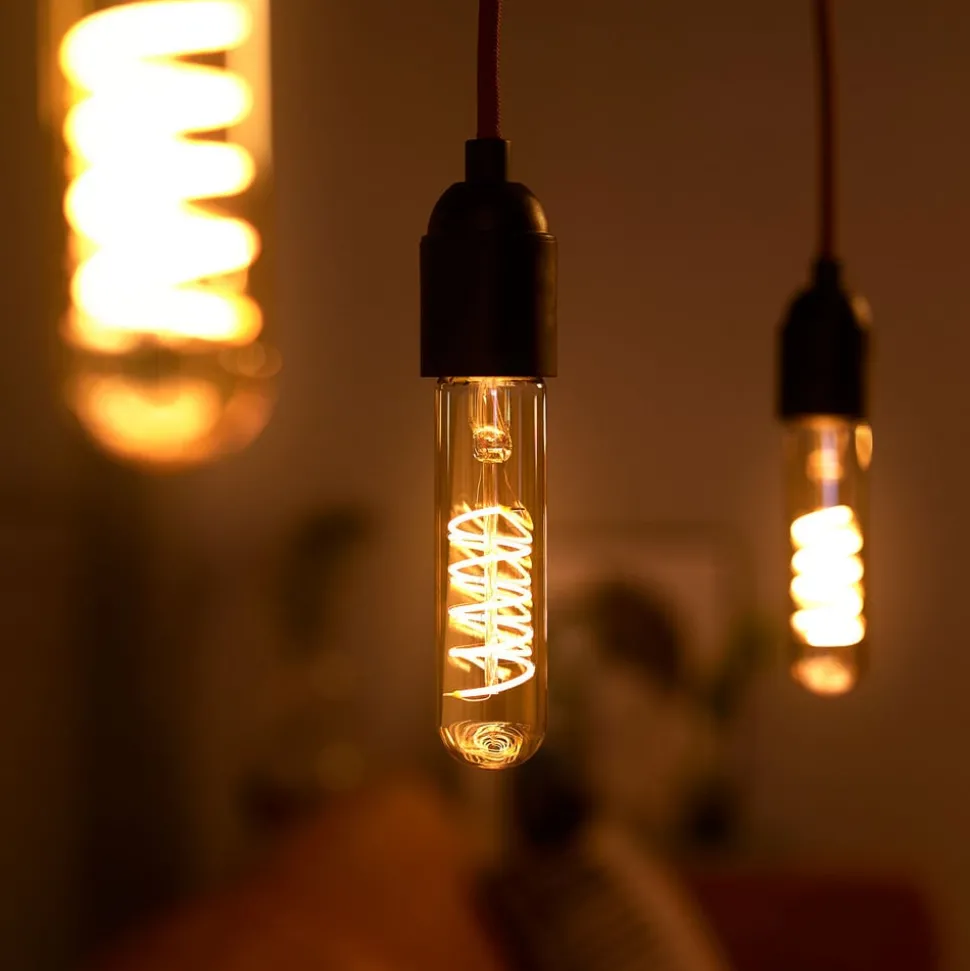 In een gedraaide look zijn de LED’s gerangschikt in de buisvormige lamp met E27 voet. Ze geven een zeer warm licht (1.800K). De lamp, die bijzonder mooi oogt in elk type armatuur zonder kap, voegt naast een gezellige lichtbron ook nostalgische charme toe aan de kamer.
