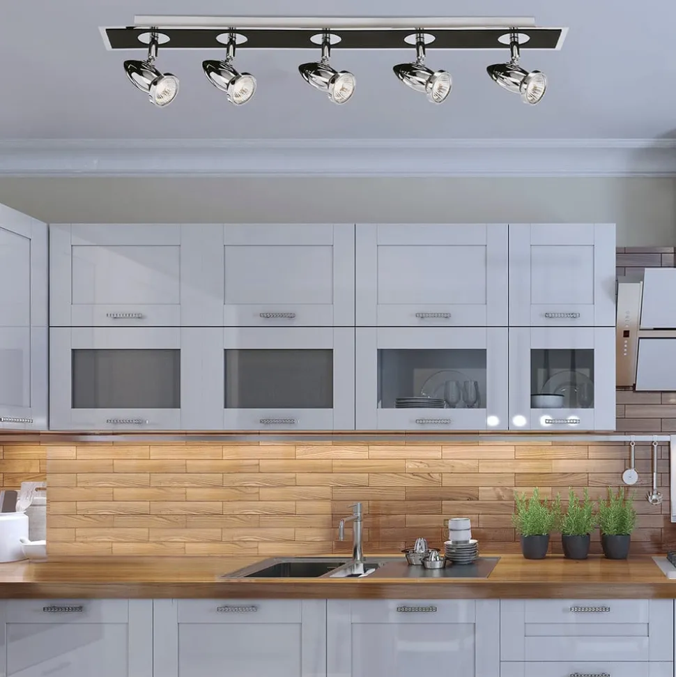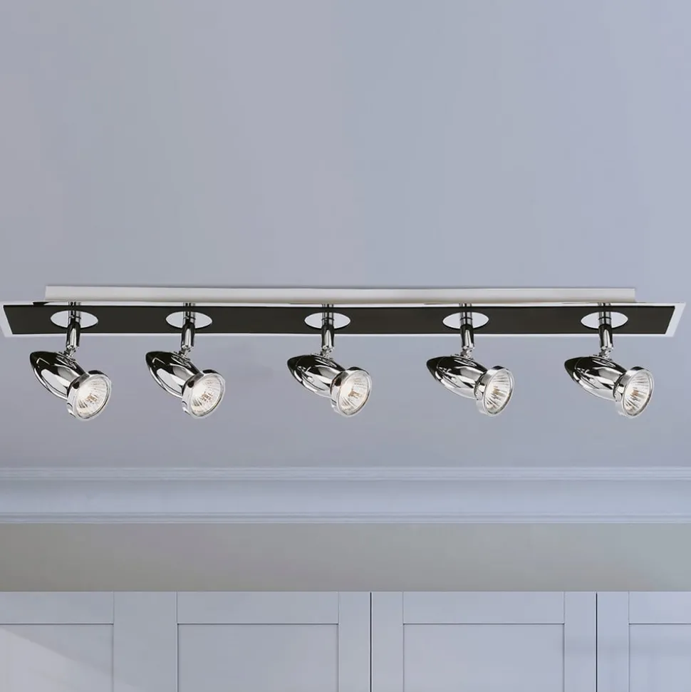 Met deze plafondbalk kan de hele ruimte verlicht worden. Elke spot kan naar wens gericht worden, zodat elke hoek van de kamer verlicht wordt. De spots bevatten halogeenlampen. Een plafondlamp met klasse en zeer moderne uitstraling!
