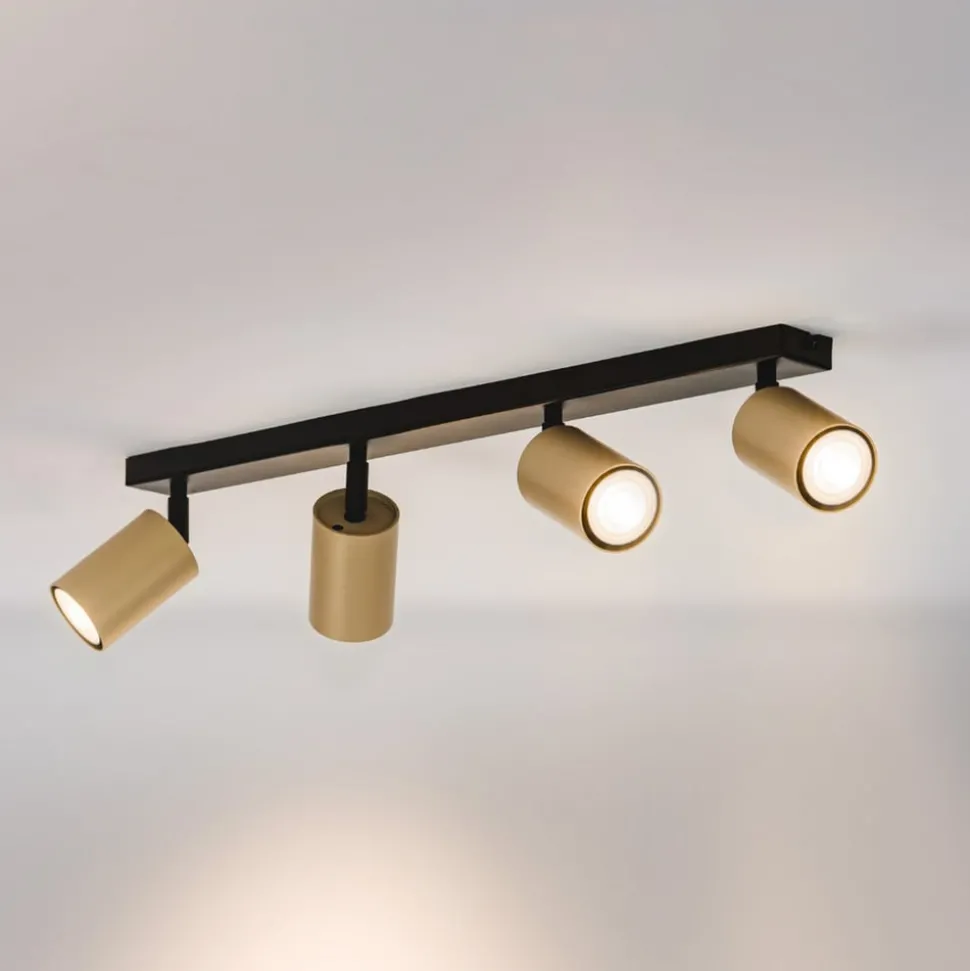 De plafondspot Zoom, 4-lamps, in de stijlvolle kleurencombinatie zwart en goud, combineert modern design met functionele verlichting. Deze spot is gemaakt van hoogwaardig staal en biedt een duurzame en robuuste oplossing voor verschillende woonruimtes, zoals de woonkamer, hal, keuken en eetkamer. De mogelijkheid om de spot te dimmen met een externe dimmer maakt een flexibele aanpassing van de lichtintensiteit mogelijk, zodat verschillende sferen kunnen worden gecreëerd en de ruimte optimaal kan worden verlicht.