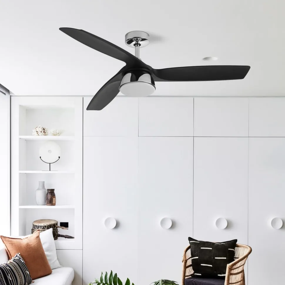 Elegante Bronx plafondventilator met LED verlichting, drie bladen en stille gelijkstroommotor – afstandsbediening De Bronx plafondventilator combineert drie zwarte bladen van ABS kunststof met een metalen behuizing in een chromen afwerking. De bijzonder stille gelijkstroommotor maakt Bronx de perfecte keuze voor de slaapkamer. In de zomer zorgt Bronx voor een koel briesje. In de winter ondersteunt de omkeerbare draairichting de verwarmingsfunctie. De LED lamp geïntegreerd achter een gesatineerde kap kan worden gedimd en de lichttemperatuur kan worden geregeld. Ook geschikt voor verlaagde plafonds. Functies: Bronx heeft een zuinige, geluidsarme gelijkstroommotor met zes snelheidsstanden en omkeerbare draairichting. De ventilator en verlichtingsfuncties worden bediend met de bijgeleverde afstandsbediening. Technische gegevens: – Motorsnelheid: 250/220/190/160/140/100 tpm – Motorvermogen: max. 38 W – Luchtcirculatie: max. 160 m³/min – Timerfunctie: automatische uitschakeling van de ventilator na 1, 4 of 8 uur – Verlichting: traploos dimbaar, drietraps CCT-functie (3.000 K / 4.000 K / 6.000 K) Opmerking: De afstandsbediening werkt op twee AAA-batterijen (niet meegeleverd).