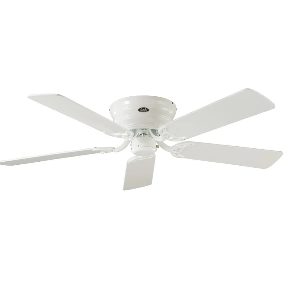 Classic Flat III plafondventilator – wit gelakte behuizing, wit/lichtgrijs gelakte omkeerbare bladen Classic Flat III zorgt voor een aangename bries, zelfs in lage ruimtes, dankzij het platte ontwerp. Hij bestaat uit een witgelakte metalen kap en vijf bladen die aan beide zijden kunnen worden gemonteerd, met een witte of lichtgrijze gelakte zijde. Functies Of het nu in de zomer of in de winter is – met voorwaartse en achterwaartse werking (regelbaar via schuifregelaar) en drie ventilatorsnelheden (regelbaar via trekschakelaar), Classic Flat III draagt altijd bij aan een aangenaam ruimteklimaat en biedt dankzij de warme luchtcirculatie in de winter de mogelijkheid om te besparen op verwarmingskosten. De uitgebalanceerde roterende componenten zorgen voor een welkome stille werking. Technische gegevens – Uit te breiden met afstandsbediening (zie accessoires) – Alleen installatie op horizontale Decks – Drie snelheidsniveaus